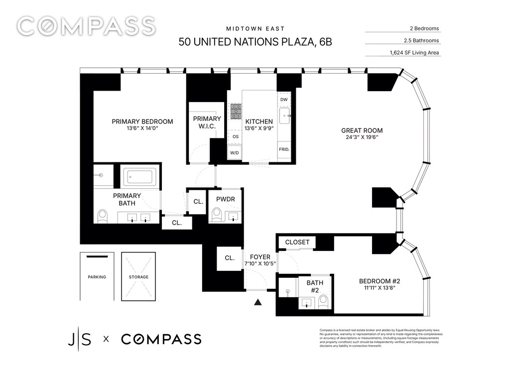 Introducing Residence 6B at 50 United Nations Plaza — a sophisticated 1,624-square-foot, two-bedroom, two-and-a-half-bath home offering a rare blend of refined luxury, gracious proportions, and serene city living. Designed by legendary architects Foster + Partners, the residence showcases meticulous craftsmanship and beautifully balanced interiors throughout. A formal entry gallery leads into an expansive living and dining area with floor-to-ceiling windows framing open city and East River views, delivering brilliant natural light throughout the day. The sleek, modern kitchen features top-of-the-line appliances, custom cabinetry, and elegant finishes ideal for both everyday living and entertaining. The generously sized primary suite offers a peaceful retreat with a spa-caliber en-suite bath, radiant heated floors, and abundant closet space. The second bedroom, also en-suite, is perfect for guests, a home office, or a flexible private space. A beautifully designed powder room completes the layout. This residence also comes with its own private parking space and a dedicated storage unit within the building — an exceptional convenience rarely offered in the city. 50 United Nations Plaza is a full-service luxury condominium with world-class amenities, including a 75-foot lap pool, state-of-the-art fitness center, steam room and sauna, a private garage with 24/7 valet service, and a distinguished doorman/concierge team providing unparalleled service. A premier home in one of the city’s most architecturally acclaimed condominiums, Residence 6B delivers elegance, comfort, and a purposeful blend of privacy and convenience in Manhattan’s serene United Nations enclave.