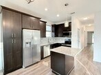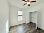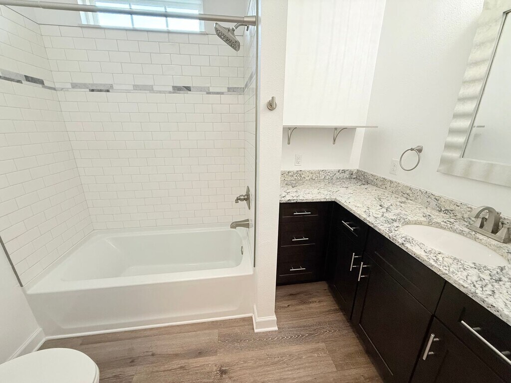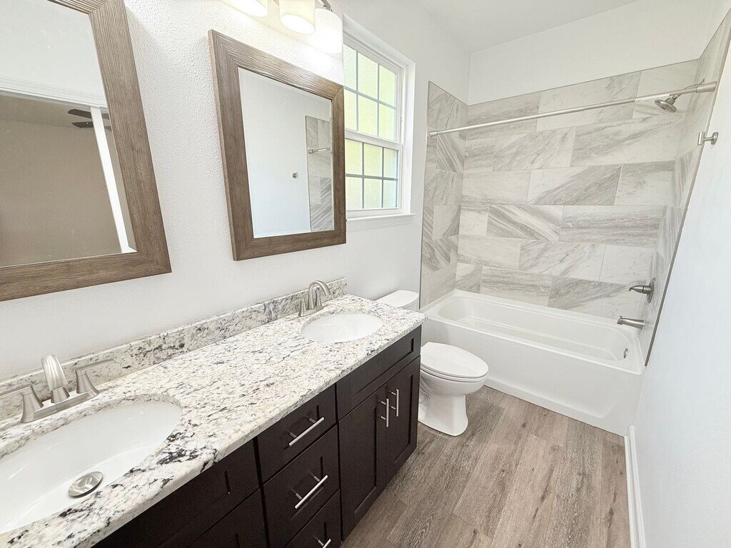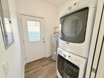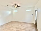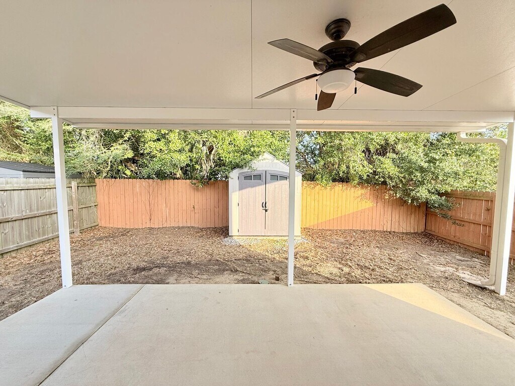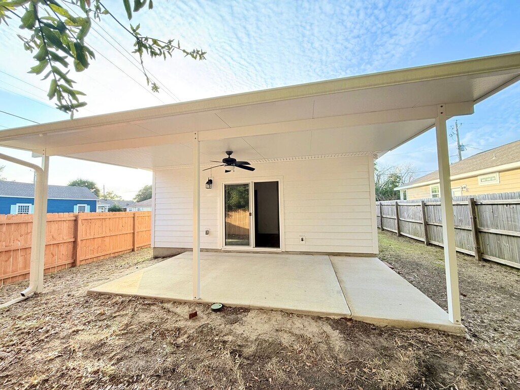 View In 3D: This 2-bedroom, 2-bathroom home offers nearly 1000 square feet of thoughtfully designed living space with an open-concept layout. The modern kitchen features ample dark cabinetry, a center island, granite countertops, a single-basin undermount sink, and stainless steel appliances, including a double-door refrigerator, flat-top range/oven, built-in microwave, and dishwasher. The primary bedroom includes sliding glass doors that lead to the backyard and an en-suite bathroom with dual vanities and a tub/shower combo. The second bedroom offers a large closet and ceiling fan for added comfort. A second full bathroom features an oversized countertop with a single vanity and a tub/shower combo accented by beautiful subway tile. Additional highlights include a dedicated laundry area with a stackable washer and dryer provided, a storage shed, a covered front porch, and a covered back patio with a ceiling fan. The fully fenced backyard provides a private outdoor retreat.