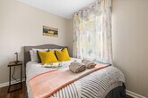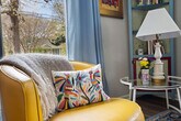 Feel at home in this centrally located and colorful home in downtown Carrboro. This handicap-accessible home is one side of a duplex and offers a charming and well-loved space. The bright and cheerful living room includes seating for 4 and a smart TV. Enjoy an assortment of books and eclectic art, listen to your favorite music using Alexa on the EchoPop, and enjoy the board games. The large and newly remodeled kitchen includes all appliances, a coffee maker, Cuisinart toaster and air fryer, and all of the pots, pans, and utensils you'll need should you want to cook from home. Complimentary coffee and tea are provided, with sugar and creamers. The private back patio has outdoor dining for 6 and a charcoal grill. The spacious bathroom features a soaking tub and roll-in/walk-in shower, ADA compliant with grab bars and a shower chair. Complimentary toiletries and towels are provided. Walk to Weaver Street Market, Breakaway Cafe, Dingo Dog Brewing and other breweries and restaurants, plus the Farmer's Market, library, tennis courts, walking trails, and Wilson Park. It's 7 minutes to UNC and 24 minutes to Duke. The town of Carrboro has free parking lots for easy access. No pets are allowed. Includes a dedicated workspace in the living room. [SI]