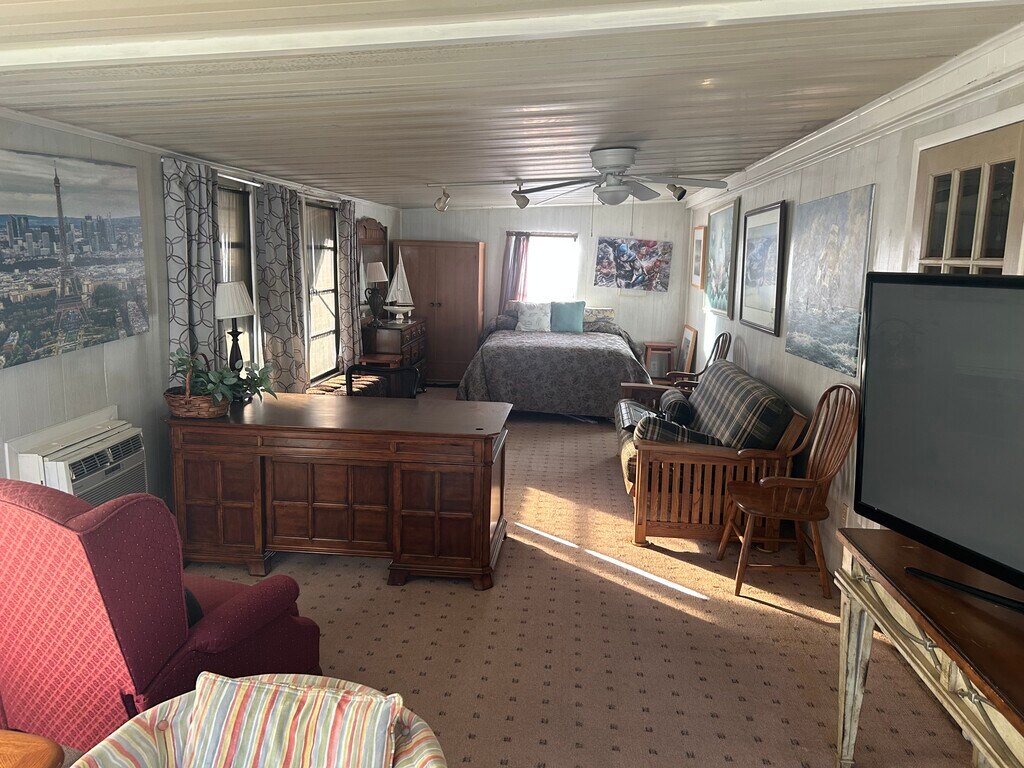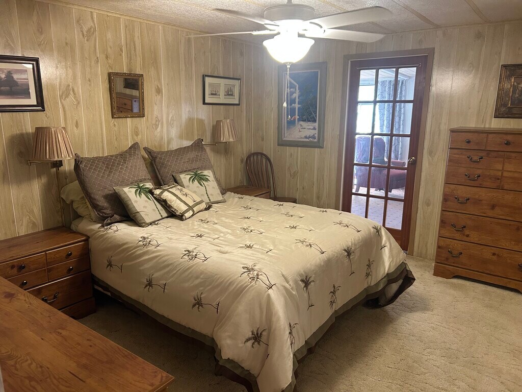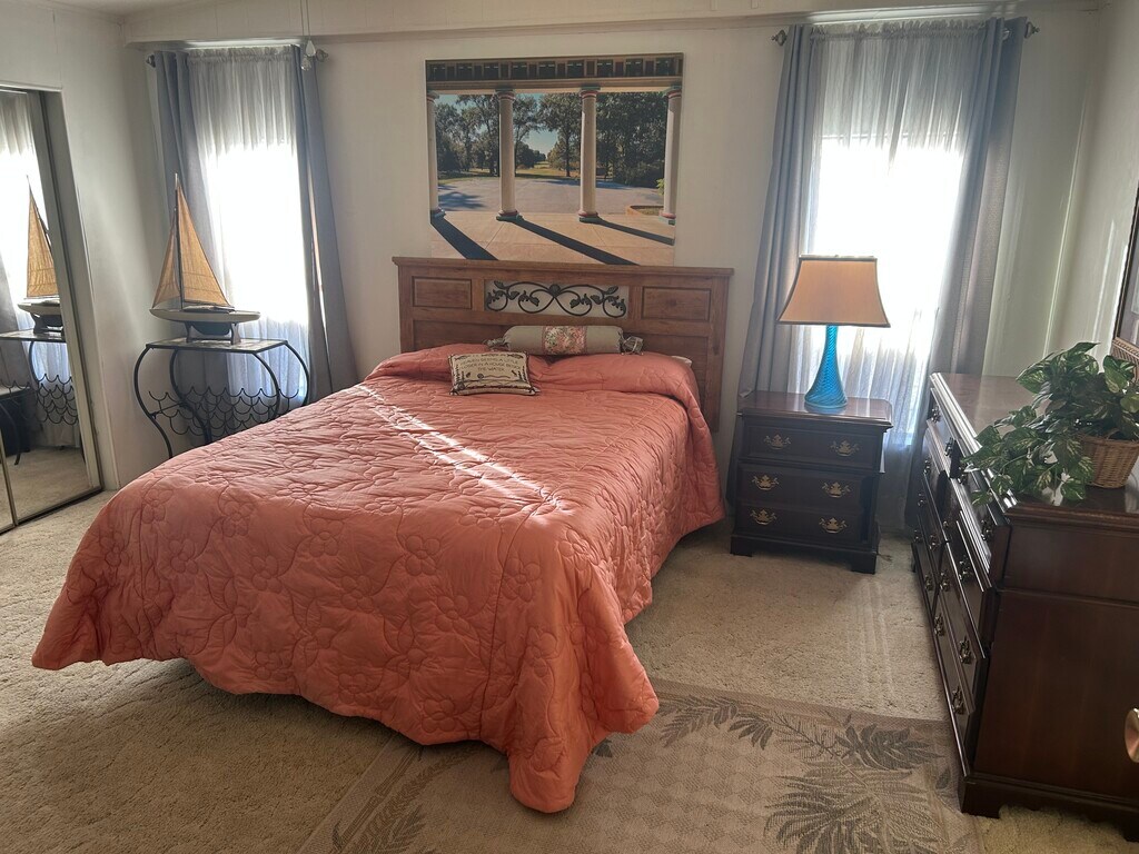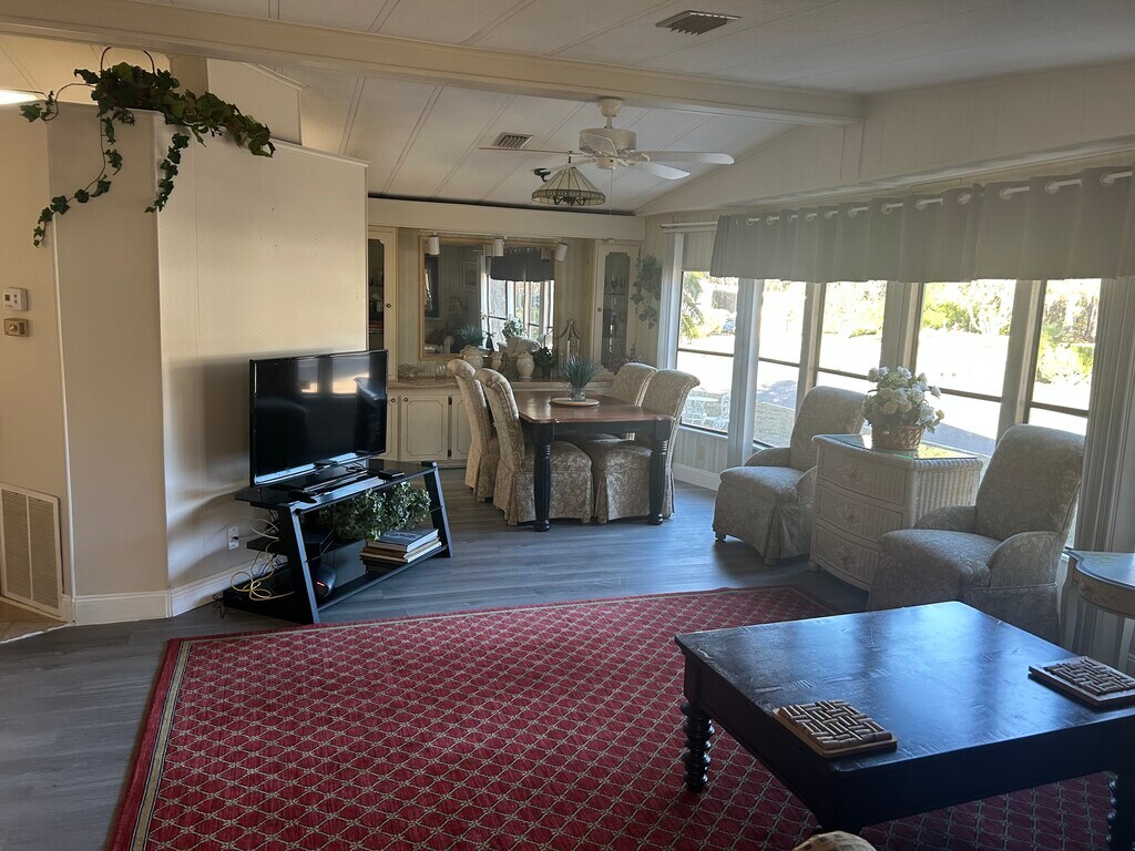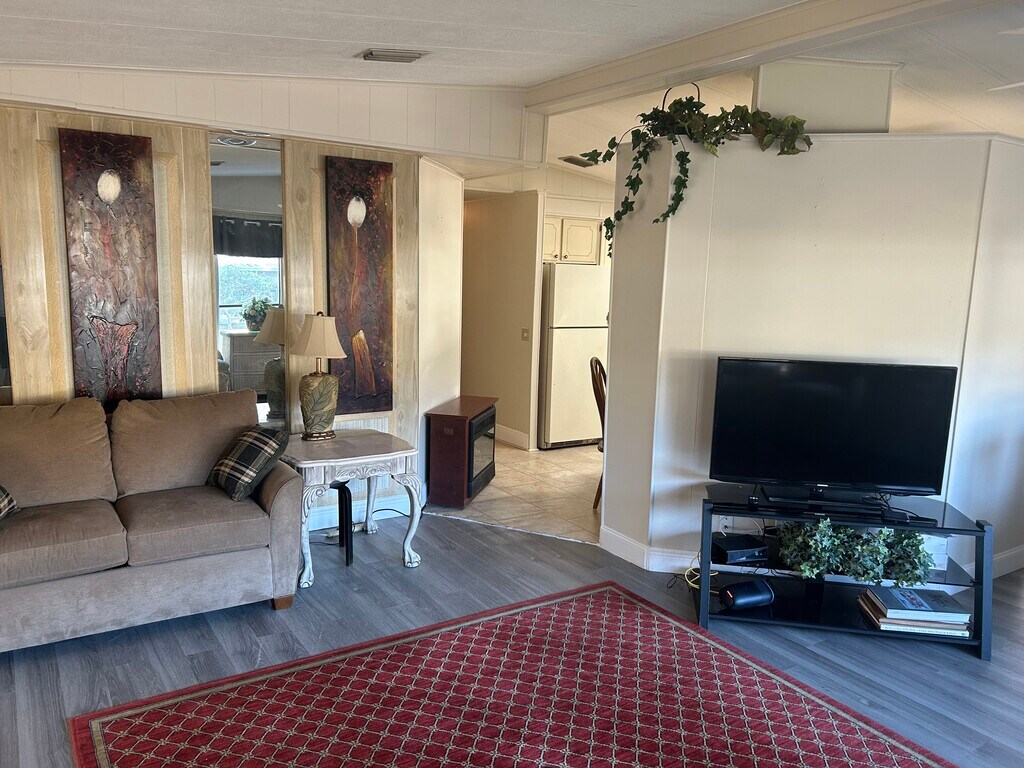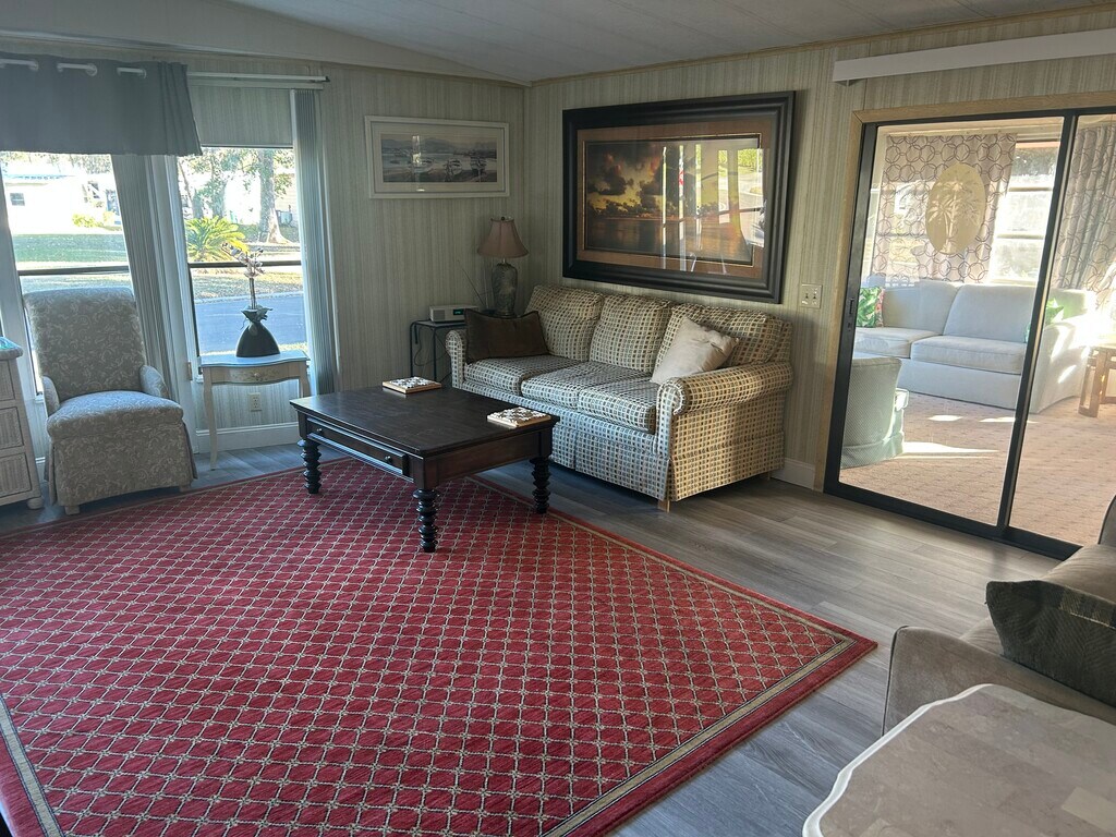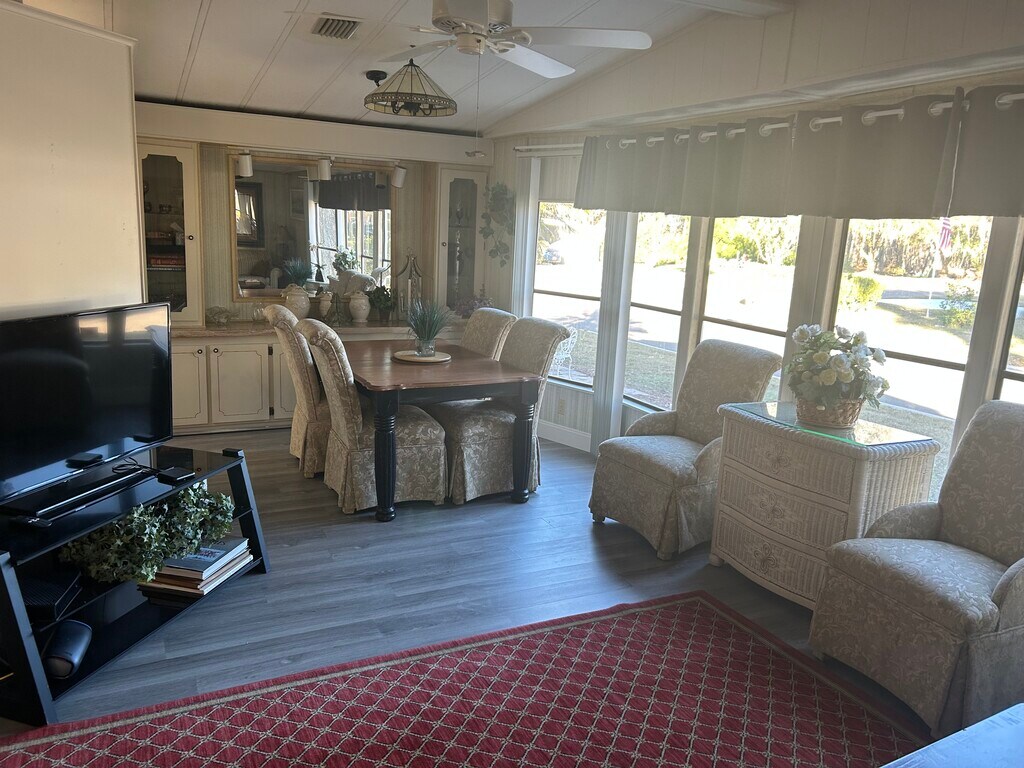 Beautiful private freestanding manufactured home with palm trees in 24 hour gated security community beautifully furnished with access to pool Pickleball, Tennis softball and 18 hole golf course just minutes from roundwood Square and totally surrounded by the Villages at half the cost includes Internet and a full cable TV package
