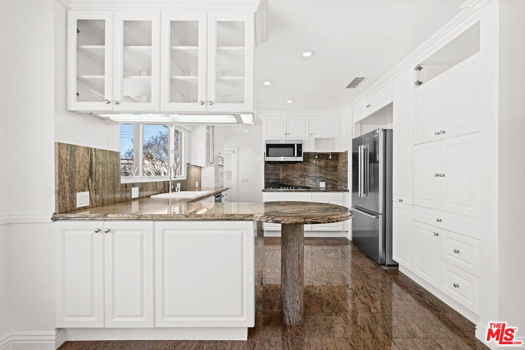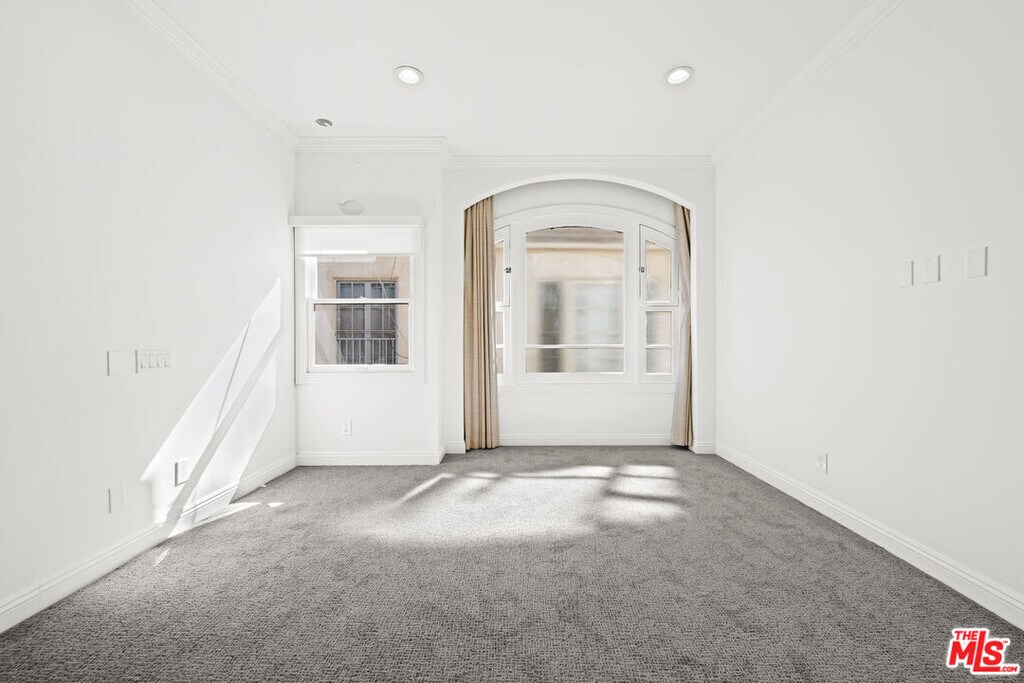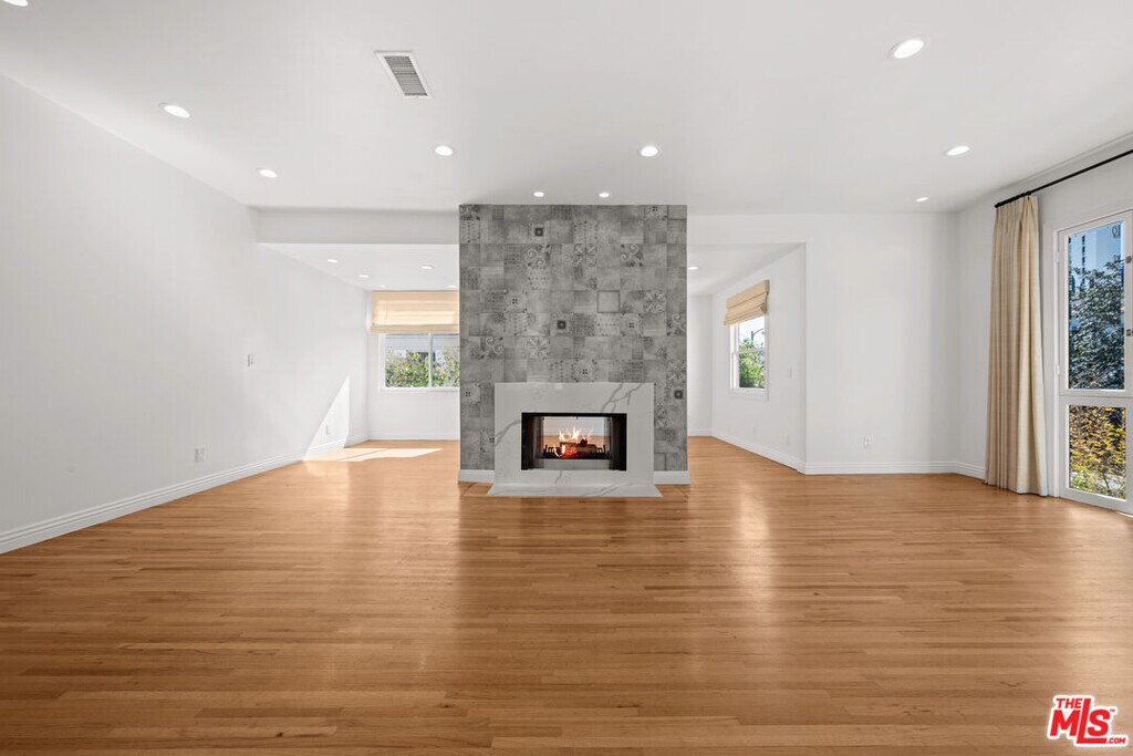 Beautifully updated and spacious 3-bedroom, 3.5-bath residence located in the heart of prime Beverly Hills. This light-filled unit features high ceilings, large windows, and a functional open layout with hardwood floors throughout the main living areas. The expansive living and dining spaces are anchored by a striking double-sided fireplace, creating a warm and inviting atmosphere. The updated kitchen offers ample cabinetry and generous storage. All three bedrooms are well-sized, each with its own ensuite bathroom, providing comfort and privacy. The primary suite includes excellent closet space and a well-appointed bath. Additional features include central A/C, in-unit washer and dryer, a private rooftop deck perfect for relaxing or entertaining, and two covered parking spaces in a secure garage. Ideally located near shopping, dining, schools, and everything Beverly Hills has to offer. A wonderful place to call home. *1 MONTH FREE PROMO! PRICE REFLECTS 12 MONTH SPREAD. BASE RENT $9,995* MLS# 26652325