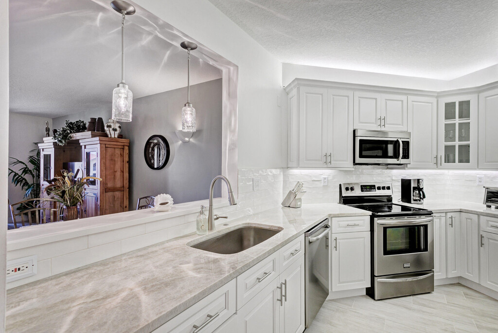 Stunning 4th-Floor Fully Furnished Condo with Lagoon Views! This gorgeous 2-bed, 2-bath condo offers breathtaking views of the lagoon and one of the two community pools from your private balcony! The newly remodeled kitchen features Quartz countertops, custom cabinetry, and stainless-steel appliances. Enjoy tile flooring in the main living areas and plush carpet in the bedrooms. The master suite has a king bed, while the second bedroom features a queen bed. Located in a gated community, enjoy two pools, Jacuzzi tubs, a fitness center, and a BBQ area. Just minutes from beaches, boating, golf, Downtown Gardens, and fine dining! Live the Florida dream in this tropical community!