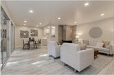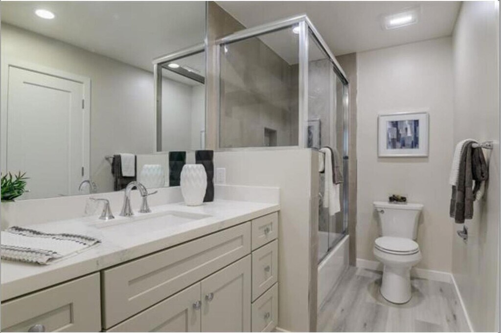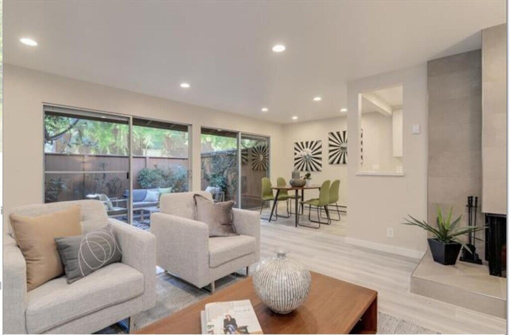 Recently renovated well-appointed single level with no one above or below. Open floor plan with large living room, tiled fireplace, recessed lighting, and a wall of french doors that lead to a private patio. Enticing kitchen with white shaker cabinets, quartz countertop, skylight, and stainless steel appliances. Separate dining area. Large bedroom with single panel closet doors and recessed lighting. Vinyl plank floors throughout. Laundry in unit. Custom bathroom with corner to corner mirror, Shaker-style vanity with quartz countertop, tiled shower over tub with designer accent finish, and glass surround enclosure. Prime location in the back of a well-maintained complex complete with swimming pool and clubhouse. Walking distance to downtown Mountain View shopping, restaurants, Stevens Creek trail, Caltrain, VTA, and Stevens Creek Trail, and easy access to freeway 85, 101, 237. RENT: $3200 SECURITY DEPOSIT: $2000 OWNER PAYS WATER & GARBAGE, TENANT PAYS ALL OTHER UTILITIES UNASSIGNED PARKING LAUNDRY IN UNIT (WASHER-DRYER COMBO) 12 MONTH LEASE MINIMUM NO SMOKING NO PETS