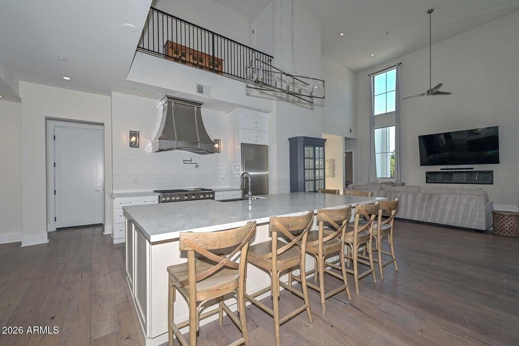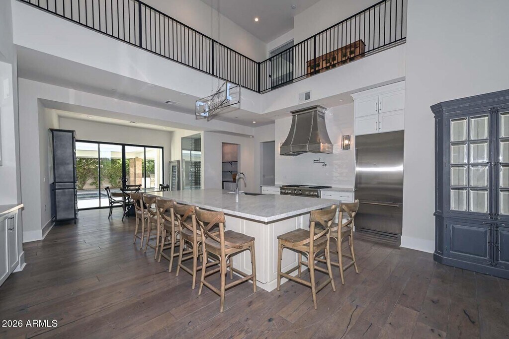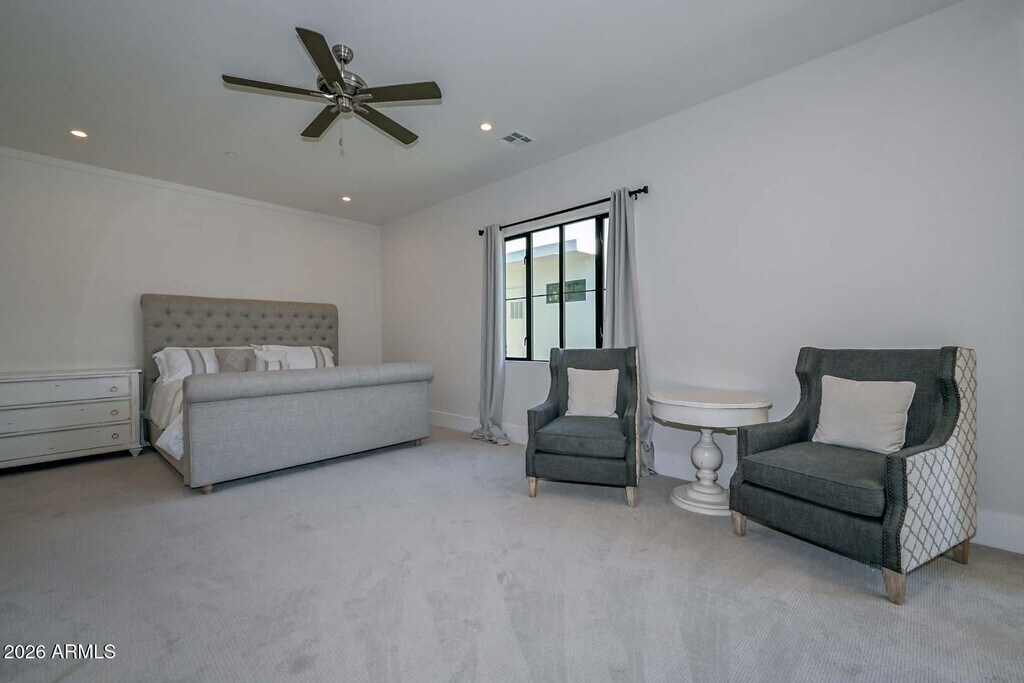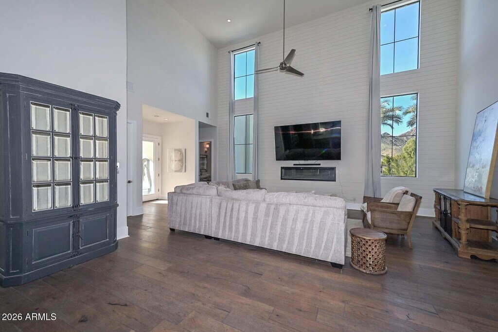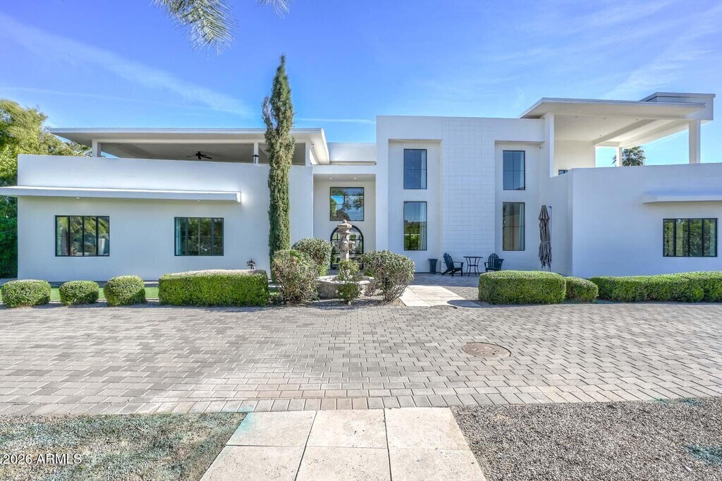 Exquisite modern estate located in the heart of Paradise Valley,offering refined desert luxury and exceptional indoor-outdoor living. The main residence features six spacious bedrooms,complemented by a private guest casita ideal for extended stays or multigenerational living. Open-concept living and dining areas flow seamlessly from a chef's kitchen with premium appliances,custom cabinetry,and oversized island. Designed for entertainment,the home includes a dedicated game room and private theater. Resort-style backyard showcases a sparkling pool and spa with multiple patio and lounge areas. High ceilings,abundant natural light,and modern finishes throughout. Prime location near world-class dining,luxury shopping,hiking,and top-rated schools.