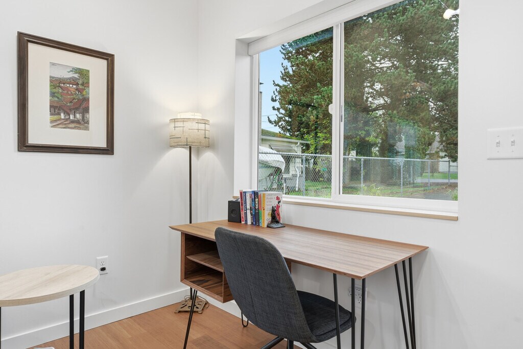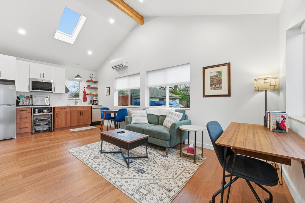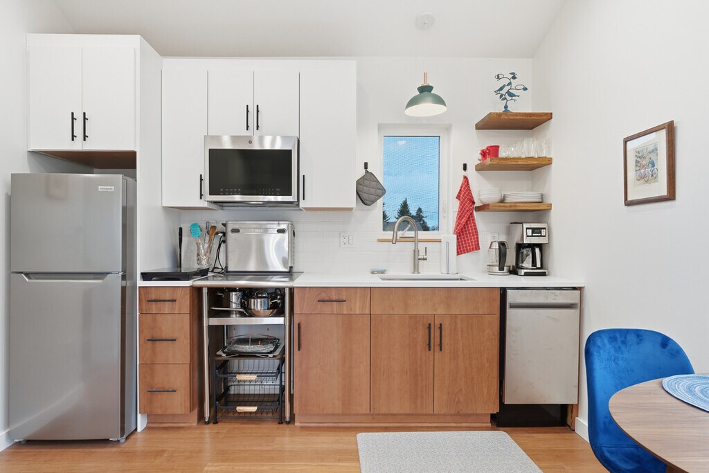 The Stephen | Cozy Modern Retreat in NE Portland Welcome to The Stephen, a charming fully furnished 1-bedroom, 1-bathroom single-level ADU tucked into a quiet residential corner of Northeast Portland. Designed for comfort, simplicity, and ease, this thoughtfully curated space is ideal for traveling professionals, insurance housing guests, couples, or individuals seeking a peaceful and efficient home base for an extended stay. Step inside and enjoy an inviting open layout with warm finishes, abundant natural light, and a seamless blend of living, dining, and kitchen spaces. The home's streamlined design creates a bright, calming environment that supports both relaxation and productivity. A dedicated workspace within the living area offers a practical setup for remote work, study, or daily tasks. The Stephen is intentionally designed with a simplified kitchen setup rather than a full-size range. While there is no traditional stove or oven, the home is equipped with a single-burner induction cooktop and a countertop oven/toaster, making it well-suited for light cooking, reheating, and everyday meals. This setup works especially well for guests who enjoy dining out, meal delivery, or minimal cooking during their stay. The bedroom features a plush queen-sized bed dressed in premium linens, a full-size closet, and calming décor to ensure restful nights. The bathroom is clean, modern, and well-appointed with thoughtful touches for everyday comfort. The Stephen comes fully furnished and move-in ready, with all utilities included, private in-unit laundry, and high-speed internet. Guests also have access to a one-car garage, currently configured as a flexible wellness and storage space rather than for parking, complete with free weights and a yoga mat for at-home fitness. Off-street parking is available for convenience. This home is best suited for guests seeking a quiet, comfortable space with intentional amenities and transparent expectations—perfect for a 30+ day stay in Portland. For electric vehicle owners, on-site EV charging is available for an additional monthly fee. Details can be provided prior to booking to ensure the home is a good fit for your needs. Situated in a quiet NE Portland neighborhood, The Stephen offers easy access to grocery stores, parks, cafés, and key commuter routes. Its central location provides quick travel to PDX Airport, the Alberta Arts District, downtown Portland, and major employment centers—making it a practical option for both short-term assignments and extended transitions. Professionally managed by Ibis Properties, The Stephen offers a cozy, modern retreat tailored for simplicity, comfort, and everyday ease. Whether you're here on assignment, relocating, or simply need a well-appointed home in the city, this residence provides a quiet, turnkey solution in an excellent location. For more listings and information, visit