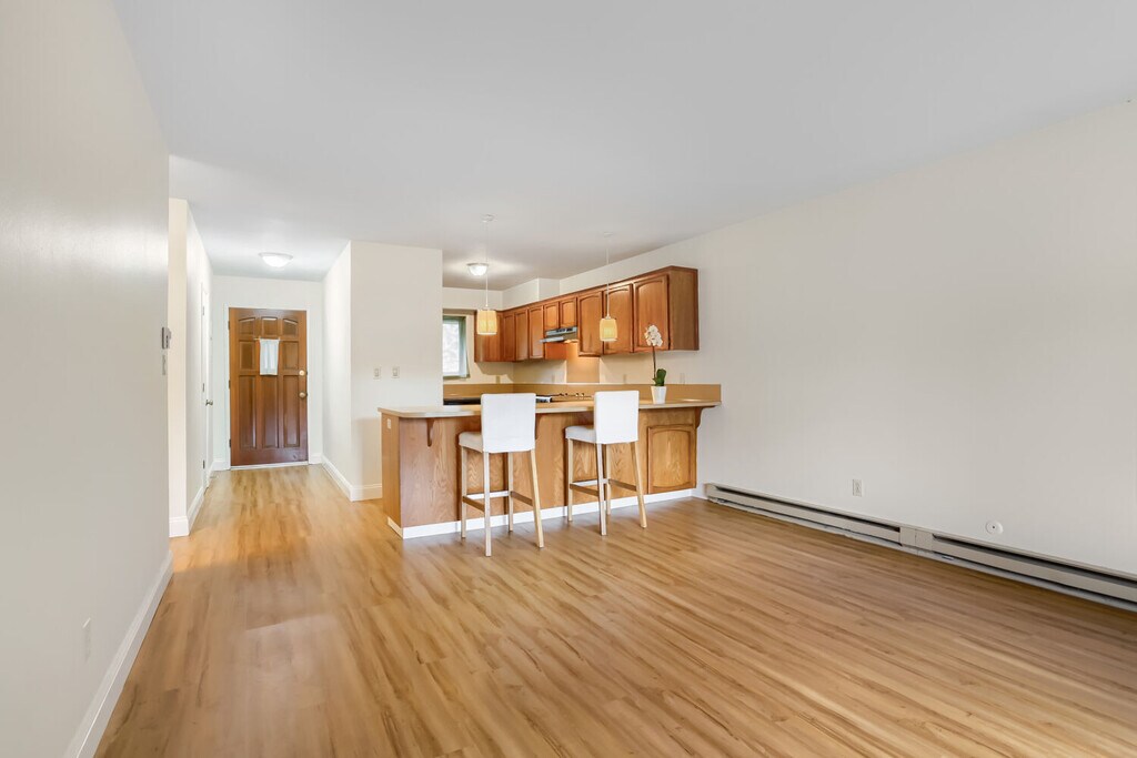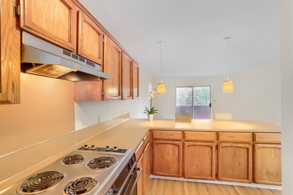 Quiet, upper-level corner unit with lots of natural light in SW Portland. Near Beaverton Hillsdale Highway with New Seasons, Fred Meyer, pubs and restaurants. This 2 bedroom/1 bath has wood-look floors, an open kitchen with ample cabinet space, and a deck with tree views. There's a small separate storage space, one reserved parking spot, and available visitor parking. Easily accessible laundry in building. Well-behaved pets are welcome. Rent includes water, sewer, and trash. Applications are accepted as of March 26th at 3pm per Portland City Code. -Utility Fee of $100/mo covers water, sewer, and trash -Back deck soon to have fresh paint -Off street parking in the lot right outside of the home -Washer and dryer shared by four other units in the condominium. Washer and Dryer are coin operated. -No smoking in home -Tenants must follow rules of HOA.