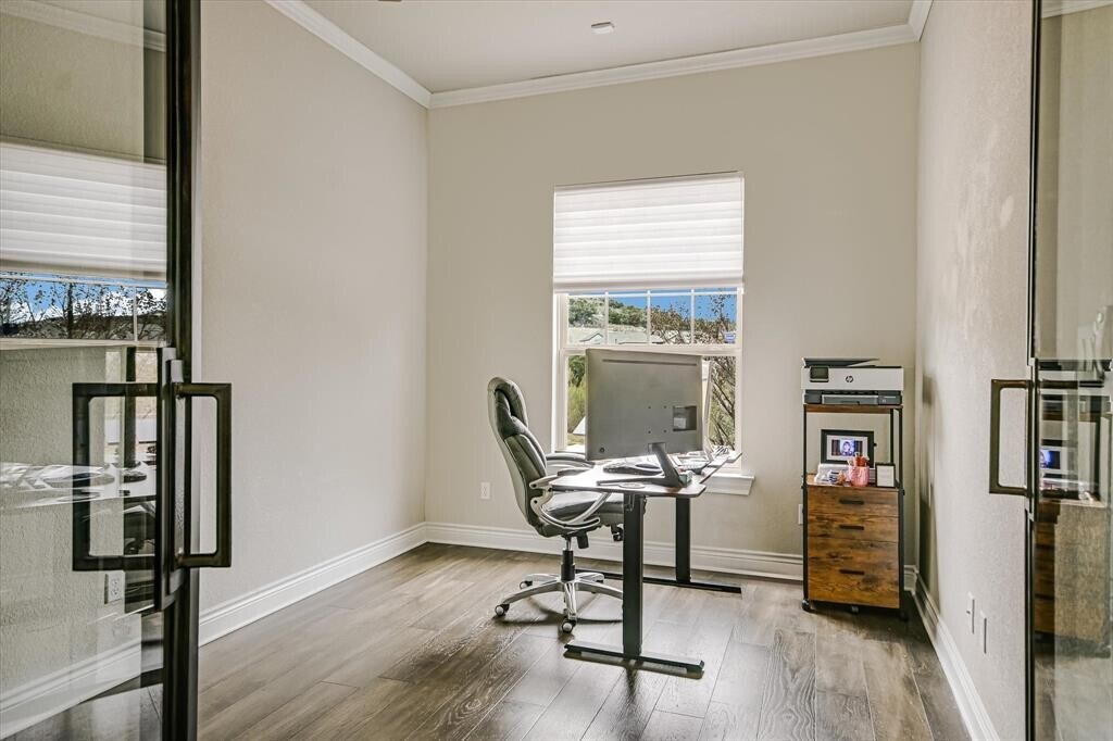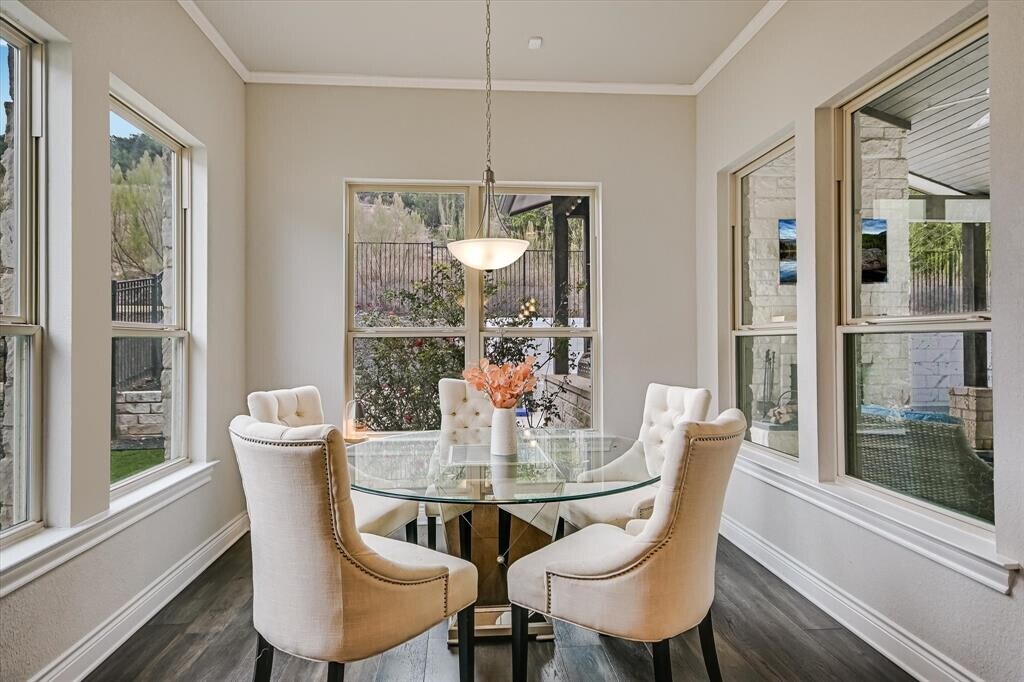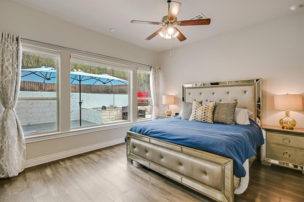 POOL/SPA, Partially furnished option (ask for list), washer, dryer, fridge included. Situated on a private greenbelt lot in the resort-style community of Rough Hollow, this stunning Century Communities Anderson Plan features 5 bedrooms & 4.5 baths including both the primary suite & guest bedroom on the main level, ideal for multigenerational living or hosting guests. A dramatic two-story foyer & living room create an impressive first impression with soaring ceilings, abundant natural light, & hardwood floors throughout main living areas. The open-concept kitchen is bright & timeless with white cabinetry to the ceiling, quartz countertops, coordinating backsplash, stainless steel appliances, gas cooktop, pendant lighting, & breakfast bar seating, flowing seamlessly into the family room with a cozy indoor fireplace. Upstairs, enjoy a game room & dedicated media room, offering ideal spaces for entertaining and everyday enjoyment. The spa-inspired primary bath features dual vanities, a soaking tub, walk-in shower, & marble-look tile. Designed for year-round enjoyment, the backyard oasis includes a pool, spa, large covered patio, outdoor fireplace, built-in grill, & expansive pool deck for sunbathing, accessed through sliding glass doors for seamless indoor-outdoor living. The home backs to hills/greenbelt, providing privacy with neighbors on only one side. Additional highlights include a 3-car garage, covered porch entry, striking stone/stucco exterior, & excellent street appeal. Rough Hollow Resort Style Amenities—multiple pools, fitness center, restaurant, yacht club and marina, Highland Village, and 22 miles of scenic hike and bike trails. This home offers a true Hill Country resort lifestyle, just about 23 miles from downtown Austin & under 8 miles to the Hill Country Galleria. Highly rated Lake Travis ISD Schools- Serene Elem, Lake Travis Middle & High all 9/10 on Tenant to independently verify all information. MLS ID 7863019