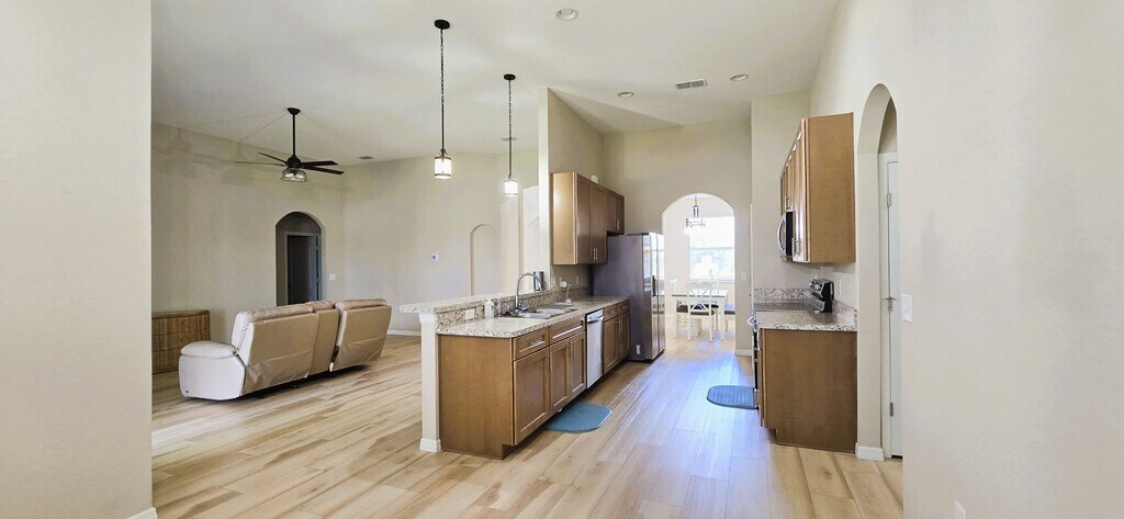 Welcome to 501 Central Ridge Ln, a beautifully designed single-family home offering space, comfort, and refined style in the heart of Frostproof. This 4-bedroom, 2-bath residence combines modern features with timeless architectural touches, perfect for both everyday living and entertaining. Step inside to an open layout highlighted by elegant finishes, natural light, and eye-catching architectural details. The formal dining room is ideal for hosting gatherings, while the spacious living areas flow seamlessly to a screened lanai, creating the perfect indoor-outdoor connection. The master suite is a true retreat, complete with a large walk-in closet and a private bath designed for relaxation. A versatile 5th room offers the flexibility to be used as a home office, den, or guest space. The kitchen is a chef's dream, featuring stainless steel appliances, sleek cabinetry, and a thoughtful design that opens to the main living area. Outdoors, enjoy a privacy-fenced backyard with lush landscaping, perfect for family activities, gardening, or simply unwinding in a serene setting. This home offers both style and practicality, with upgrades throughout and a floor plan tailored for modern living. Don't miss your chance to rent this move-in-ready gem in a welcoming neighborhood.