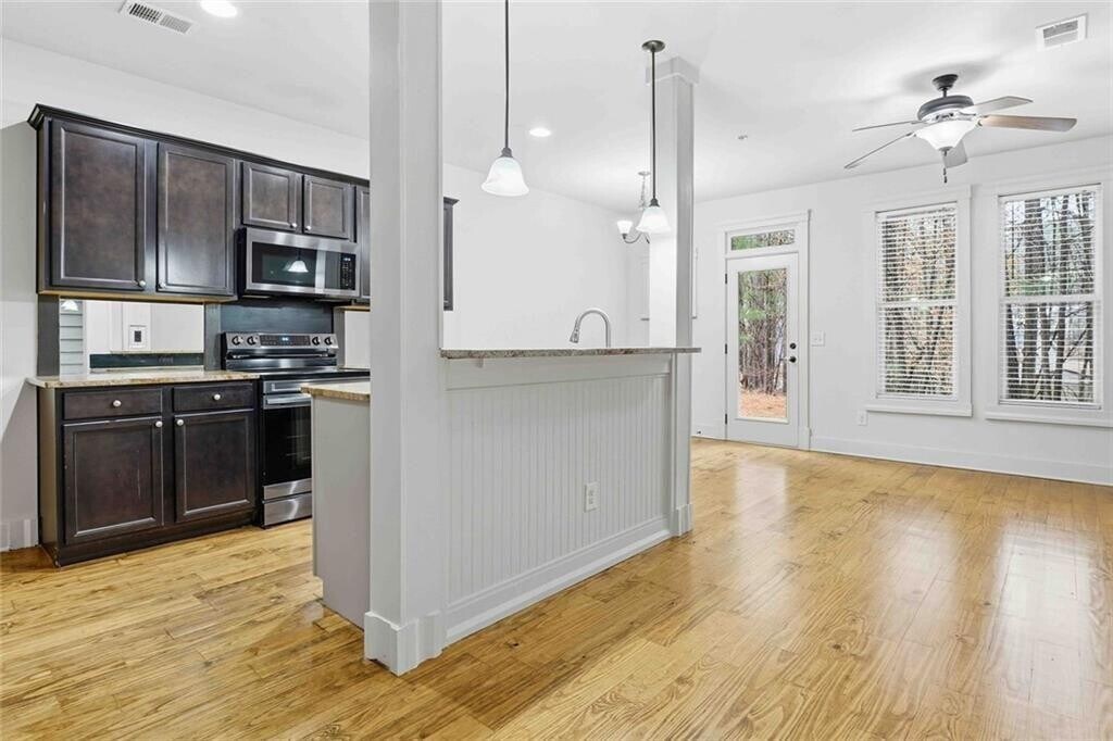 LIKE NEW,end unit townhome in River Park. This townhome has well thought out design details and function. Home has been freshly painted on the exterior and interior,with newly re-finished and distressed wide plank pine floors thru-out entire to include all bedrooms. NO Carpet! Slate tile in all bathrooms and laundry room. Granite countertops in kitchen and bathrooms,featuring an upgraded leathered finished in the bathrooms. Appliances include newer microwave,dishwasher and range. Gorgeous custom built-in shelving and trim throughout all closets,built-in niches and pantry,NO wire shelving! Private back yard area,looks out to a private wooded buffer. Enjoy wonderful River Park Amenities... Swim,Tennis,Clubhouse,Playground Area,and Community activities. Location is convenient to I-575,Downtown Woodstock and Ridgewalk area with lots of Entertainment,Shopping,Restaurants,and more. MLS ID 7754665