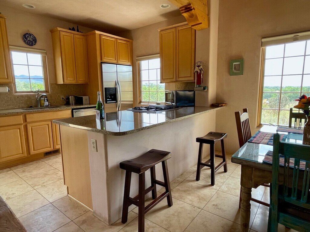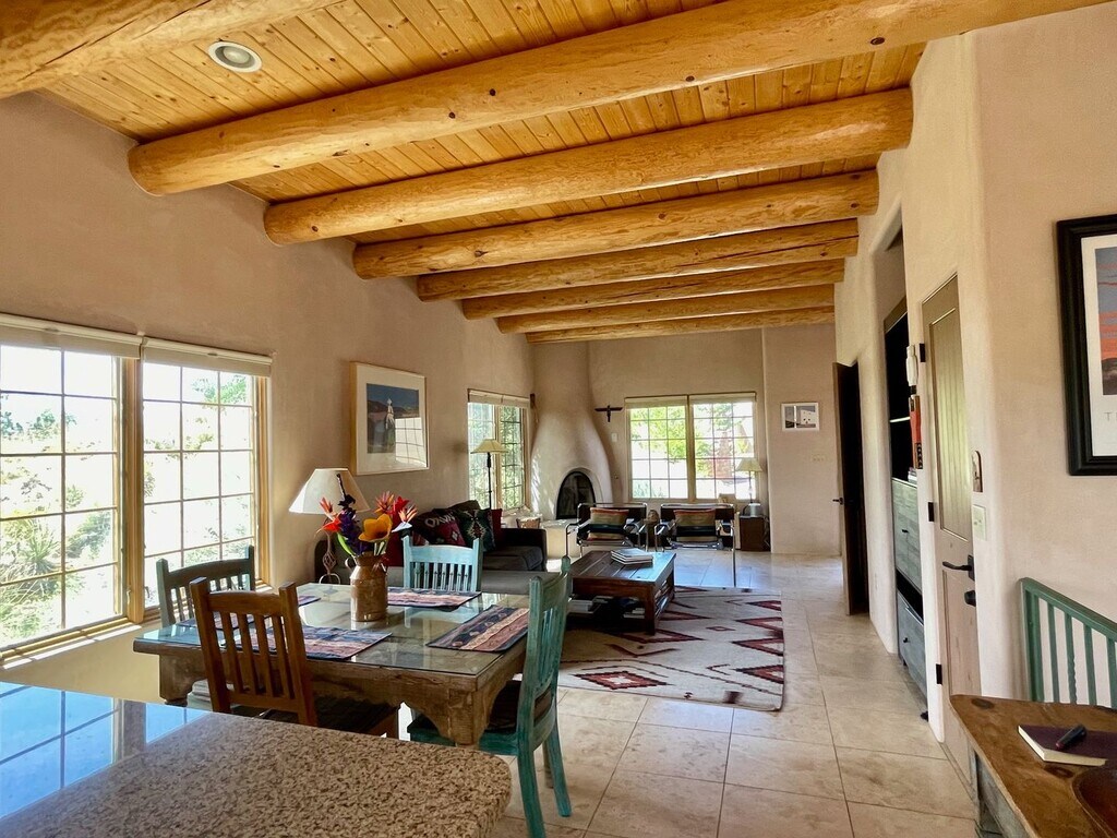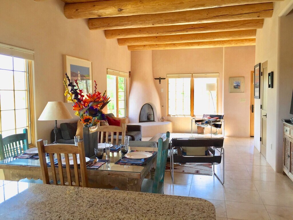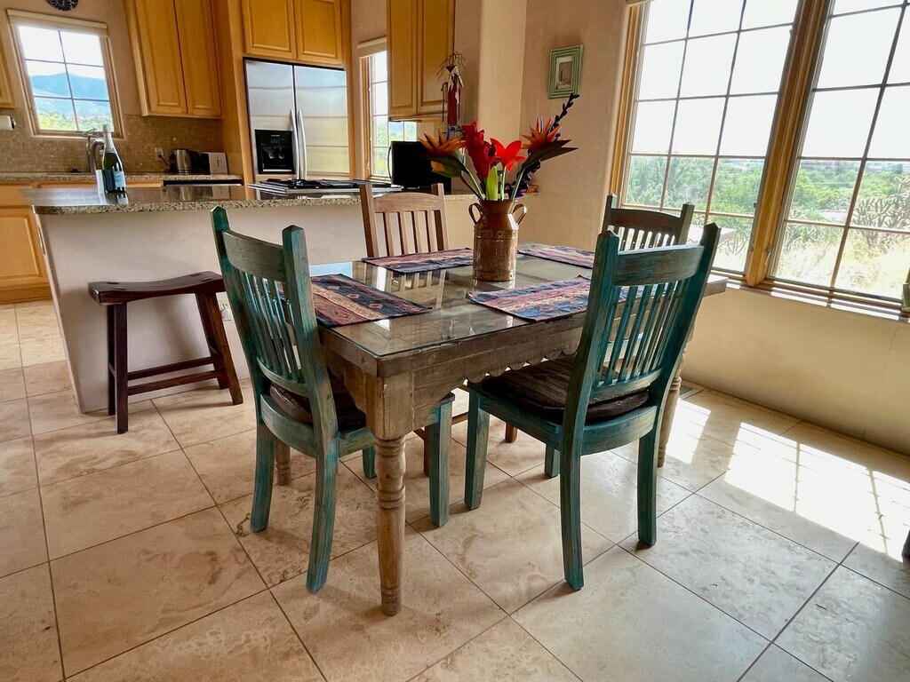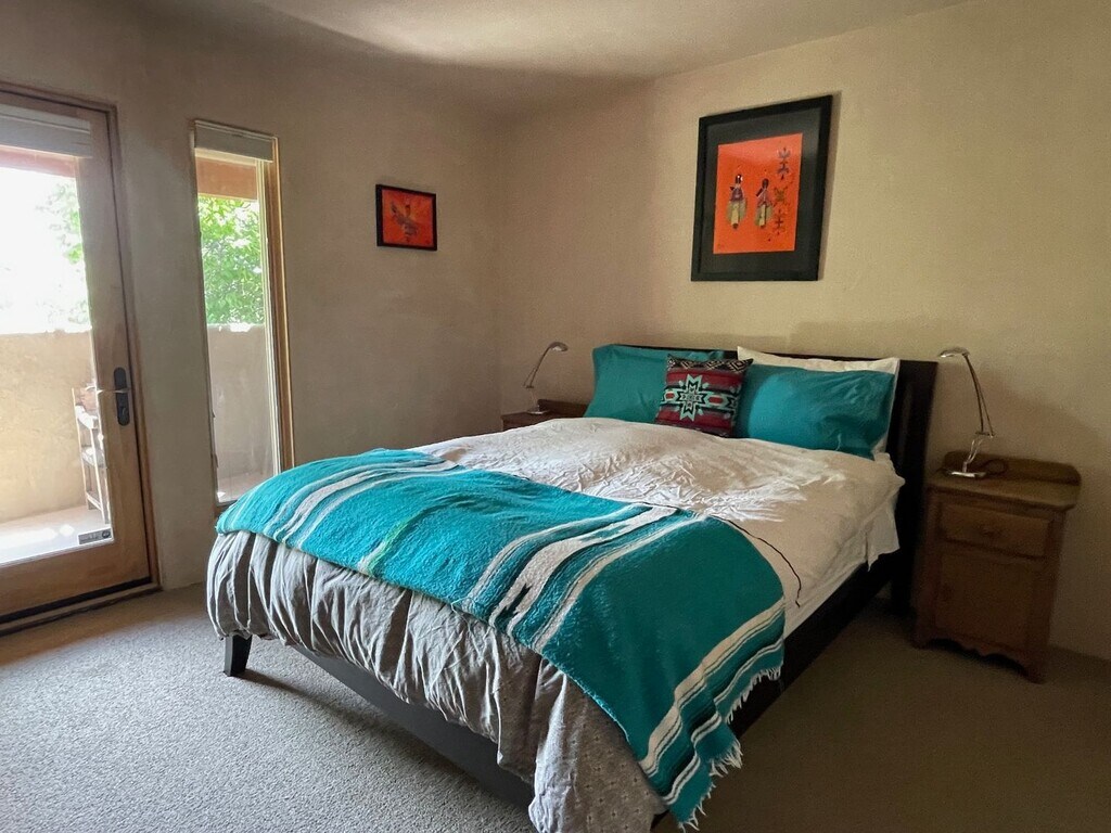 $3,000/month - 2 Bedroom | 2.5 Bathroom | 1,115 sq. ft. Located in the Rosario Hill Compound on Santa Fe’s north side! This beautiful two-story home sits at the top of Rosario Hill, providing great views of the Sangre de Cristo Mountains, city lights, and the distant mountains to the south. The main level includes the main entry, a primary bedroom, and second bedroom. The primary bedroom includes a queen bed, new HDTV, a walkout patio with views of the Sangre de Cristo Mountains, and an en-suite full bathroom. The second bedroom includes a queen bed with a small office desk, there is also a hall bathroom with a shower. The second level includes the main living area, kitchen, dining, living room, powder room, a large deck and a smaller balcony. The open-plan layout provides a wonderful flow while the decks and many windows provide views and lots of natural light. The living area includes a sofa, chairs, a gas Kiva fireplace, and an HDTV with Blu Ray DVD set up for streaming. The front balcony off the living room includes a small table and chairs. The kitchen includes high-end appliances, a gas stove with an electric oven. The light-filled dining room comfortably seats four. Offered Furnished Only Forced Air - Air conditioning and Heating Gas Kiva Fireplace Stacked washer and dryer Off-street parking Offered Furnished Only $3,000/month + utilities One year lease required Tenants Transfer All Relevant Utilities Into Their Name First Month, Last Month, and Security Deposit Required