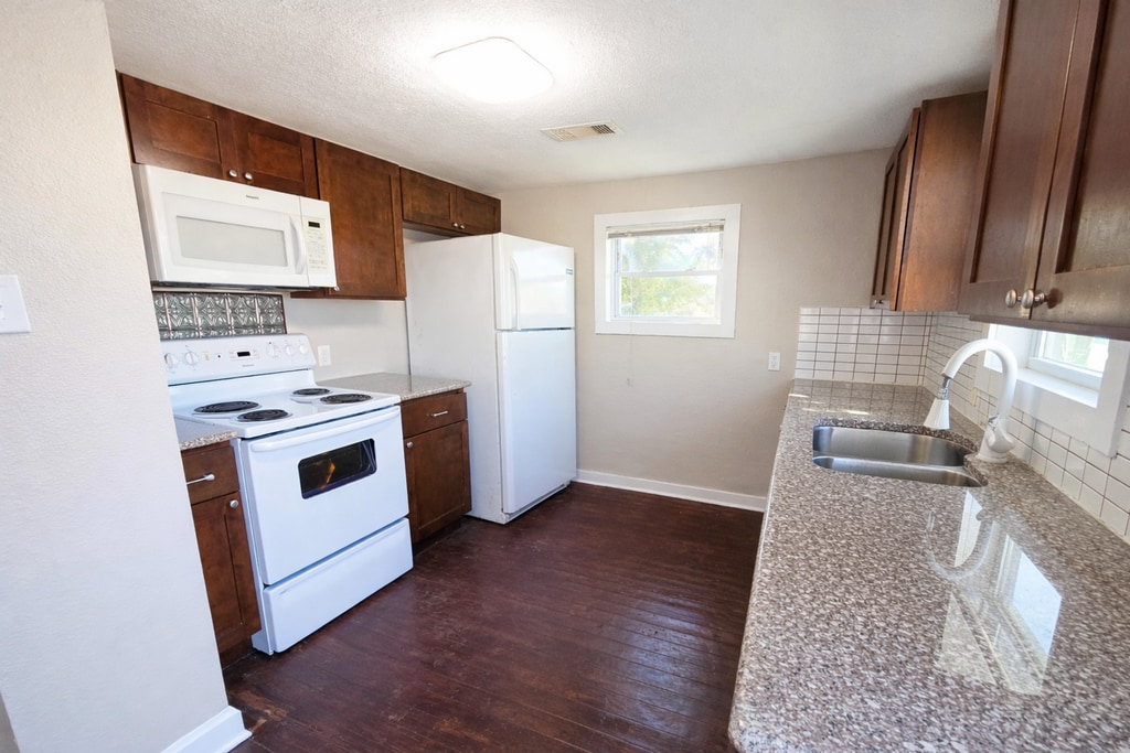 Enjoy a private entry with alleyway access, plus a dedicated garage space included with the unit. Laundry room is conveniently located downstairs in the garage. Charming and well-maintained unit featuring beautiful dark wood floors, neutral paint tones, and abundant natural light throughout. The kitchen offers granite countertops, rich wood cabinetry, white appliances, and a clean tile backsplash for a bright, functional space. A great blend of comfort, privacy, and convenience!