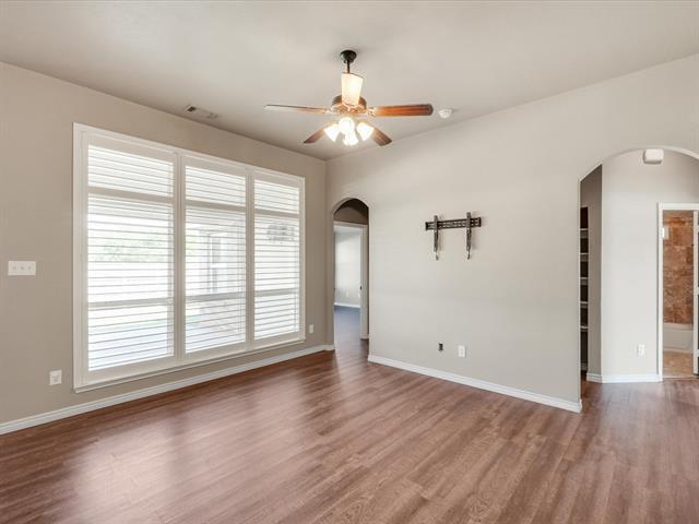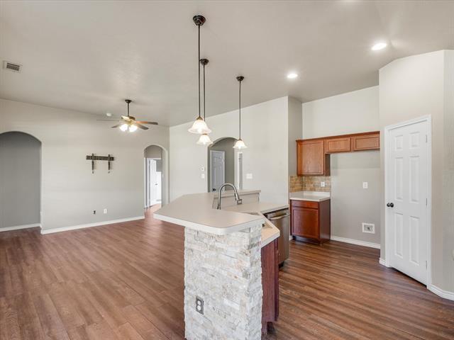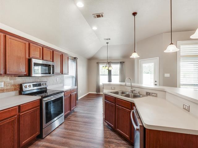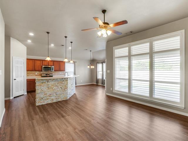 Move-in ready 1 story situated on corner lot in desirable neighborhood in Krum! Walking distance to middle & high schools. Ideal open floorplan with many upgrades! Gorgeous wood-like vinyl plank floors in all main areas, hallways & bedrooms! Bright kitchen features stone accents & backsplash, stainless steel appliances & pantry, all overlooking the spacious living room with wall of windows providing tons of natural light. Split primary suite offers soaring ceilings, private bath & walk-in closet. Enjoy relaxing moments on the huge partially covered patio with a flatscreen mount ready for your tv. Large, fenced backyard has lots of room for play. Perfect location near amenities while still having a peaceful, country setting. Local Landlord that is highly responsive- no 3rd party management company to deal with or extra hidden fees!