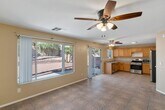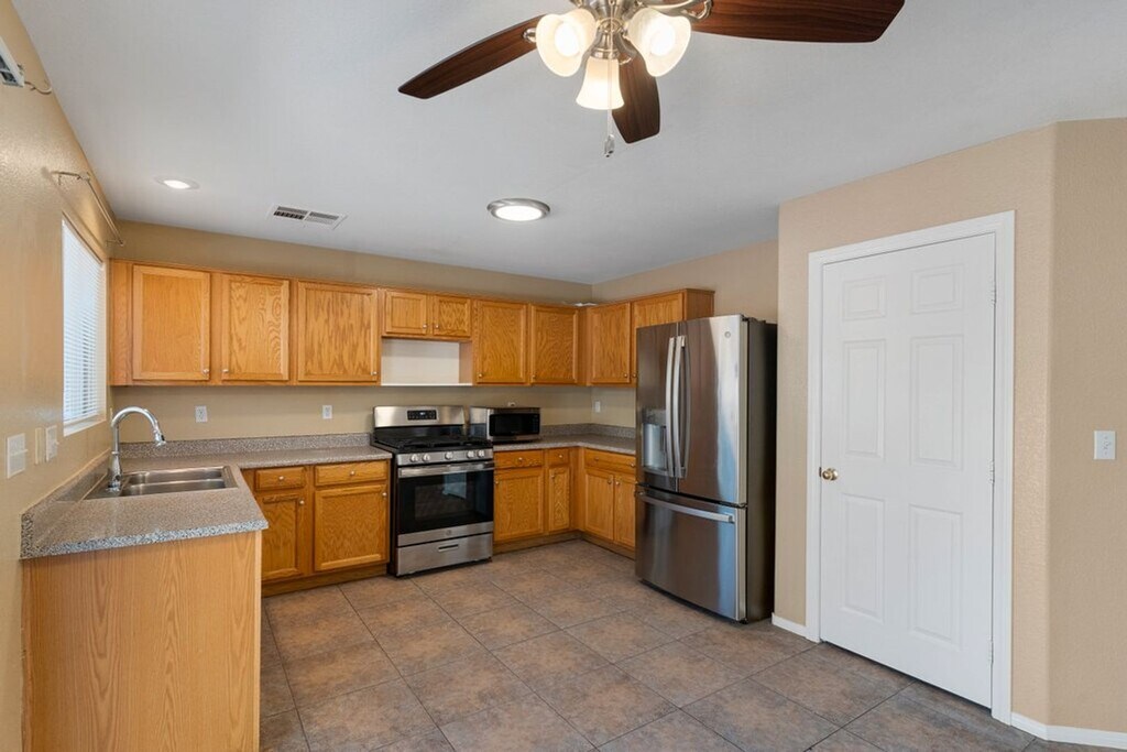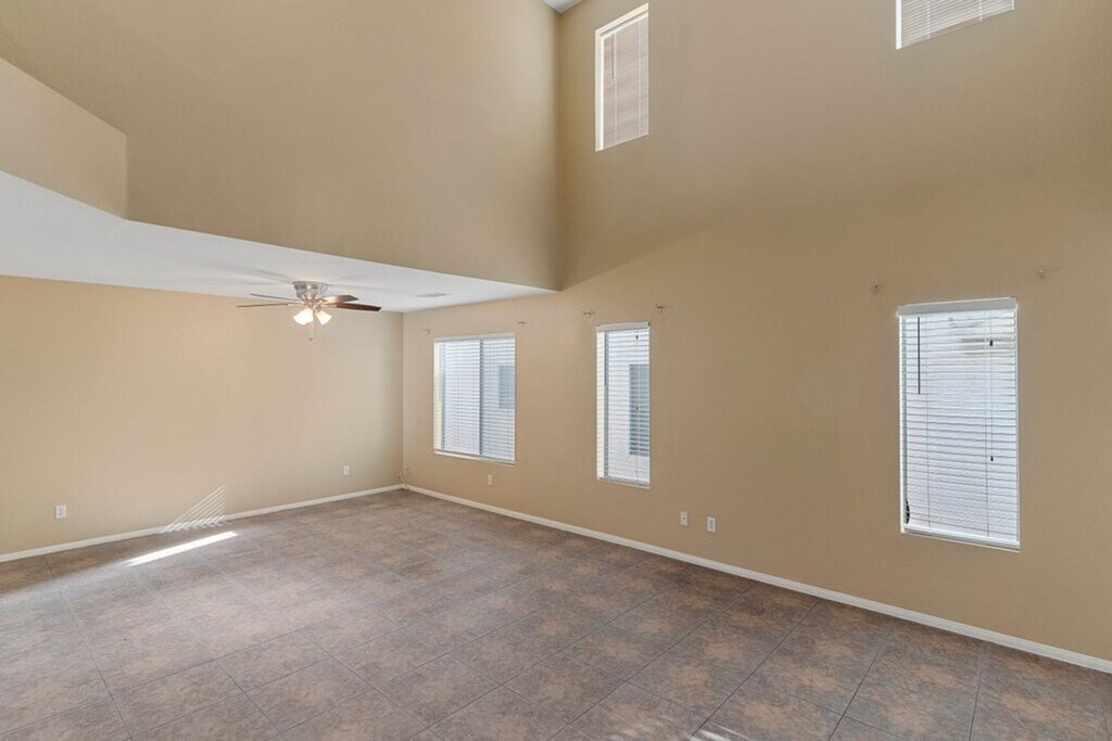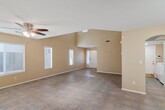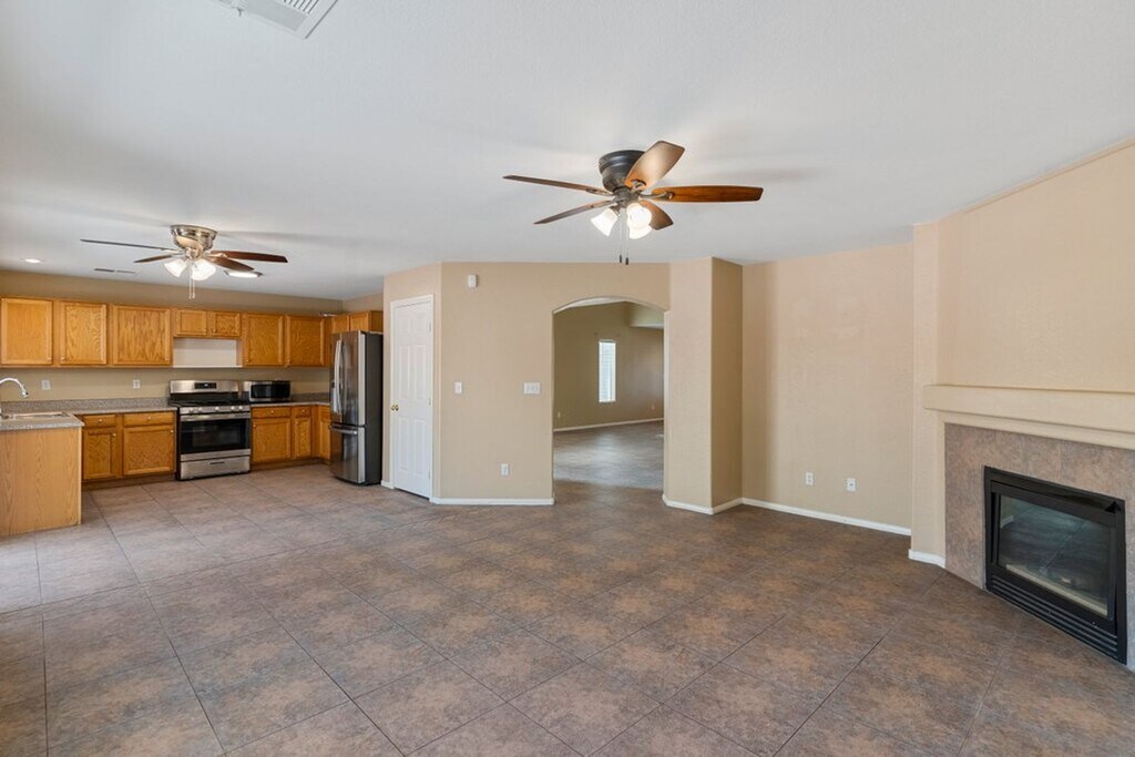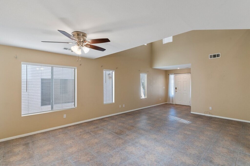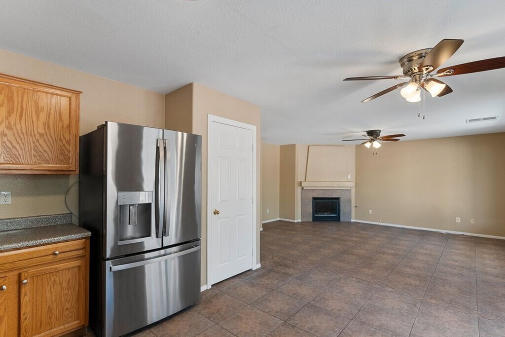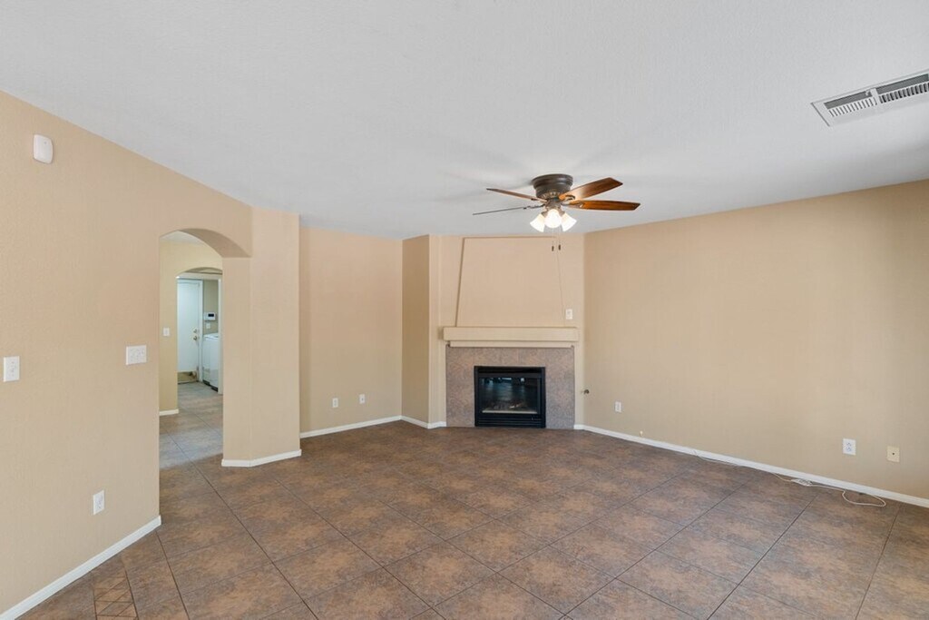 This beautiful home boasts 4 bedrooms and 2.5 baths, featuring vaulted ceilings, tile flooring, and ceiling fans throughout. The open kitchen includes a convenient pantry, while the living room offers a cozy fireplace. A dedicated laundry room provides ample extra storage. The primary bedroom is a true retreat with picturesque windows, decorative pot shelves, and a private ensuite. The primary bath offers a separate garden tub and shower, along with a spacious walk-in closet. Outside, enjoy a spacious backyard complete with a covered patio and low-maintenance desert landscaping. TENANTS PAY AN ADDITIONAL $70 A MONTH TO PREMIER FOR TRASH AND SEWER SERVICES.