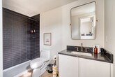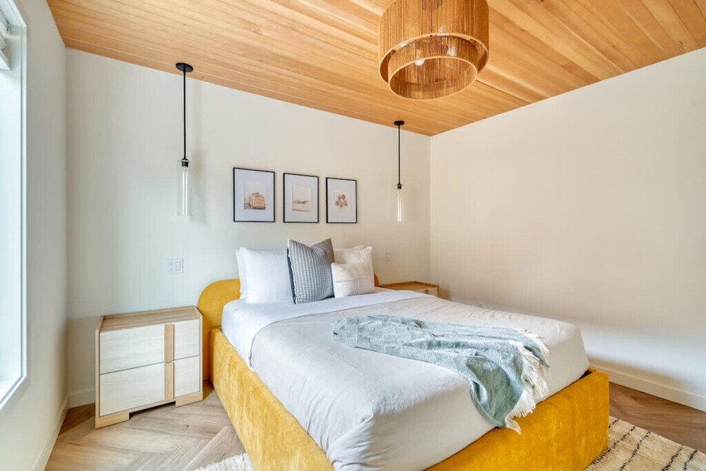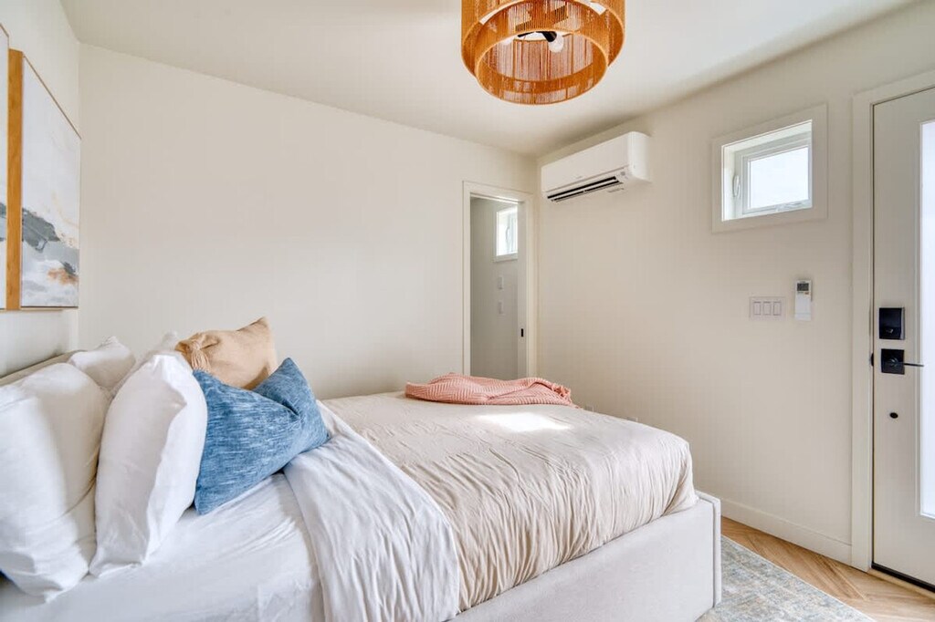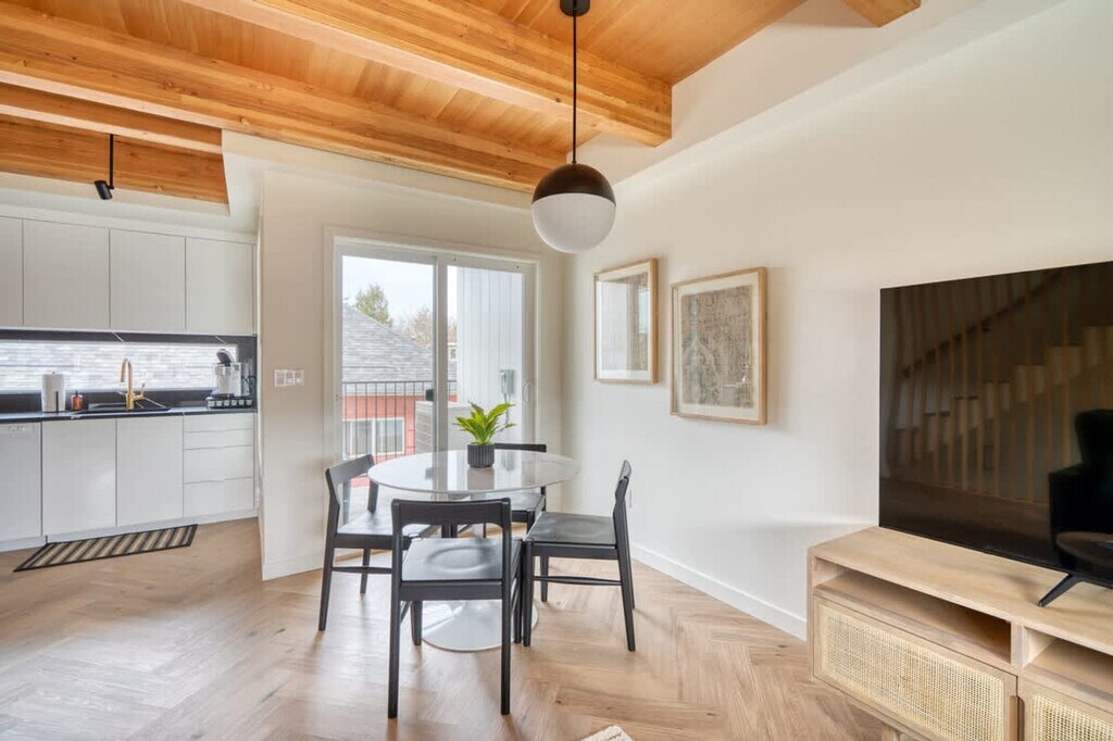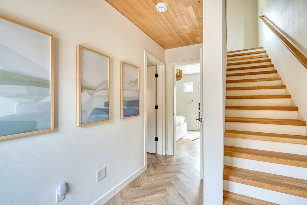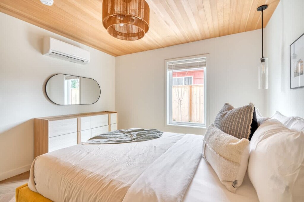 Stay steps from Portland’s Alberta Arts District in this stylish townhome featuring vaulted ceilings, herringbone floors, and abundant natural light. The apartment includes a private in-law suite with its own entrance and kitchenette, a chef’s kitchen, Juliet balconies, and a cozy patio. Walk to top restaurants, parks, and shops in one of Portland’s most vibrant and creative neighborhoods. The ground floor offers two private bedrooms, including a fully separate in-law suite with its own entrance, kitchenette, lounge space, and en-suite bathroom, ideal for those seeking privacy. The second bedroom on this floor is quiet and restful with warm textures and quality linens. The main floor boasts soaring wood ceilings, oversized windows, and herringbone floors. Cook in the sleek open kitchen stocked with everything from sharp knives to a French press. Lounge in the stylish living area with a Smart TV, or enjoy dinner and drinks indoors or out on the cozy patio. The upper floor features two bright bedrooms opening onto Juliet balconies, a modern shared bathroom, and a laundry room, offering everything needed for extended stays. In-unit laundry is available for convenience. Alberta Arts is one of Portland’s most vibrant and walkable neighborhoods, bursting with color, culture, and creativity. Murals line the streets, and nearly every block hosts an art gallery, boutique, coffee shop, or food destination. Walk to Salt & Straw for inventive ice cream flavors, brunch at Tin Shed Garden Cafe, or enjoy local beers at Great Notion. On Last Thursdays, the neighborhood transforms into a lively open-air art walk with music, food, and local vendors. Alberta Park is just a few blocks away for a relaxing stroll. You're just 15 minutes from downtown and 20 from the airport, close to everything yet tucked into one of Portland's most beloved residential pockets. This is a new construction home with excellent soundproofing, but be respectful of quiet hours after 10 p.m. for the comfort of neighbors. Not suitable for parties or large gatherings. Self-check-in via smart lock is provided. Cats are not allowed. Fast WiFi is available throughout the apartment.