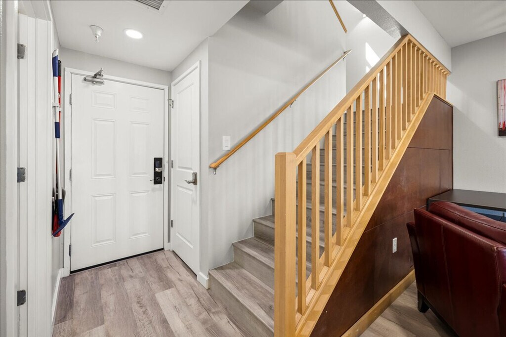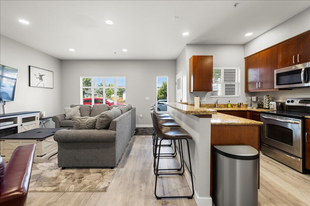 Feel at home in this modern, clean townhouse in Boise! This 1100 square foot home is in a fantastic location. The kitchen comes fully loaded with stainless steel appliances such as a microwave, fridge, stove and dishwasher, along with glasses, mugs, dishes and cutlery. This home also features a smart TV in the living room, fast Wi-Fi, an in-house washer and dryer, and professionally decorated space with unique furnishings and a warm ambiance. Free gated parking is available, plus free extra street parking. This home is within walking distance to all of downtown and the Boise Zoo, and a 10-minute walk to BSU. It's also close to the downtown restaurant scene and has easy access to our amazing local water park and Bronco Stadium and BSU campus. It's just off the I-184 exit, so there is very easy access to the rest of the valley. All of the bedrooms are upstairs, so it isn't very wheelchair/disabled friendly unless you want to sleep on the couch. The home occupancy permits 7 people. Professionally cleaned and sanitized between each and every guest. Easy self-check-in via secure door keypad. [SI]