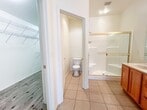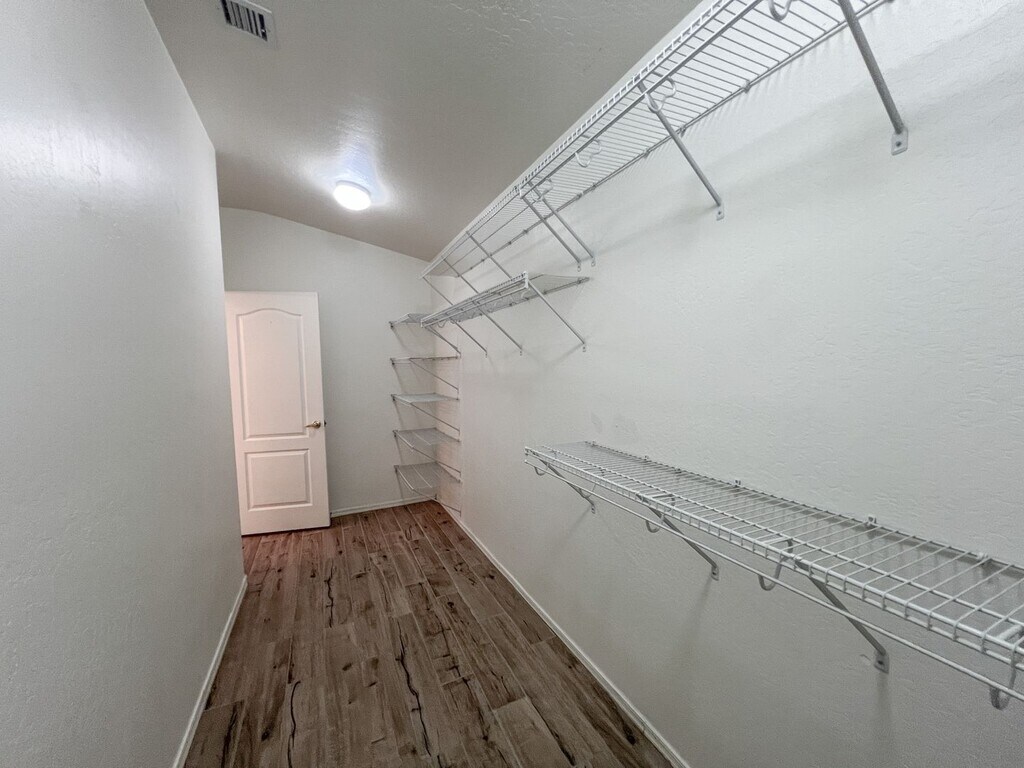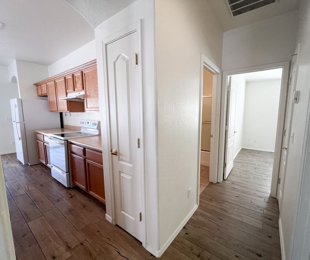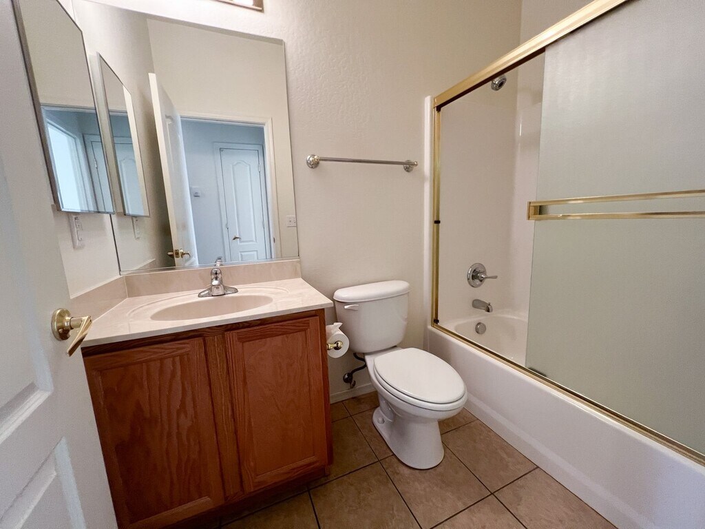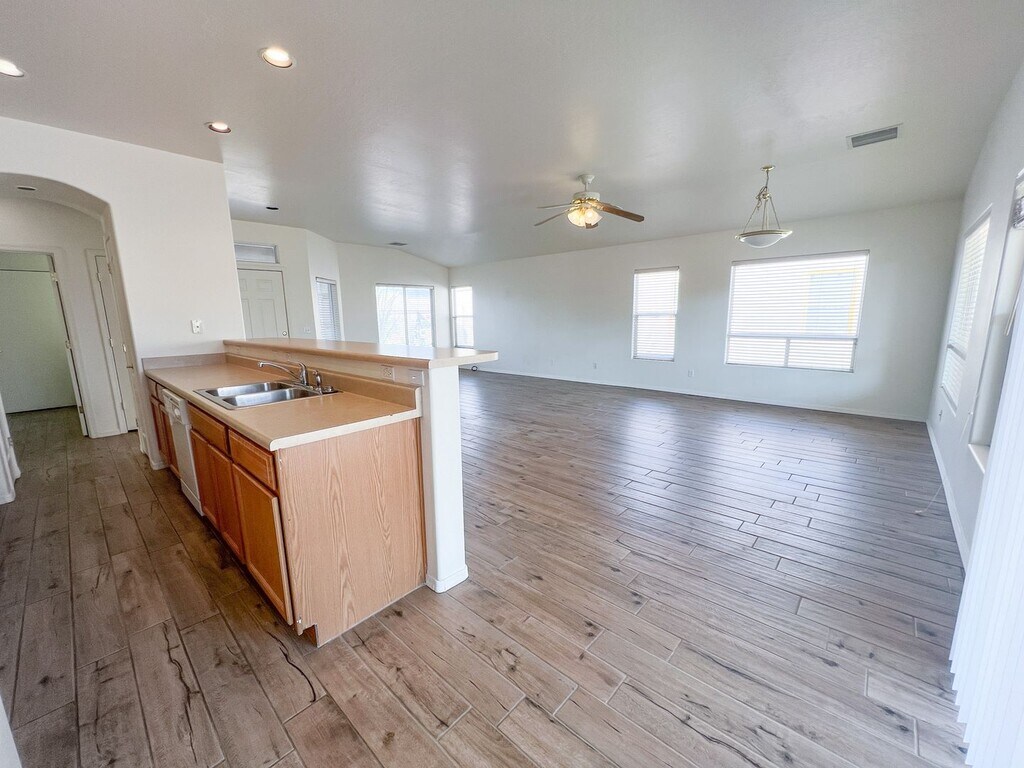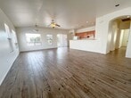 Single-level 2 bedroom, 2 bathroom home with an open floor plan, featuring ceiling fans in the main living area and master bedroom. The house boasts wood plank tile flooring throughout. Located in the gated community of Amante at Verde Santa Fe, residents enjoy access to a community pool, fitness room, and clubhouse. The master bedroom includes a large walk-in closet, an ensuite bathroom with dual sinks, and a step-in shower. The guest bathroom offers a tub/shower combo. The property also has a covered back patio, mountain views, and an attached 2-car garage. AC/Heat. Utilities for gas, electricity, and water are tenant's responsibility, while the owner covers sewer and HOA fees. Renter’s insurance is required. Pet Negotiable. Apply online at or call .