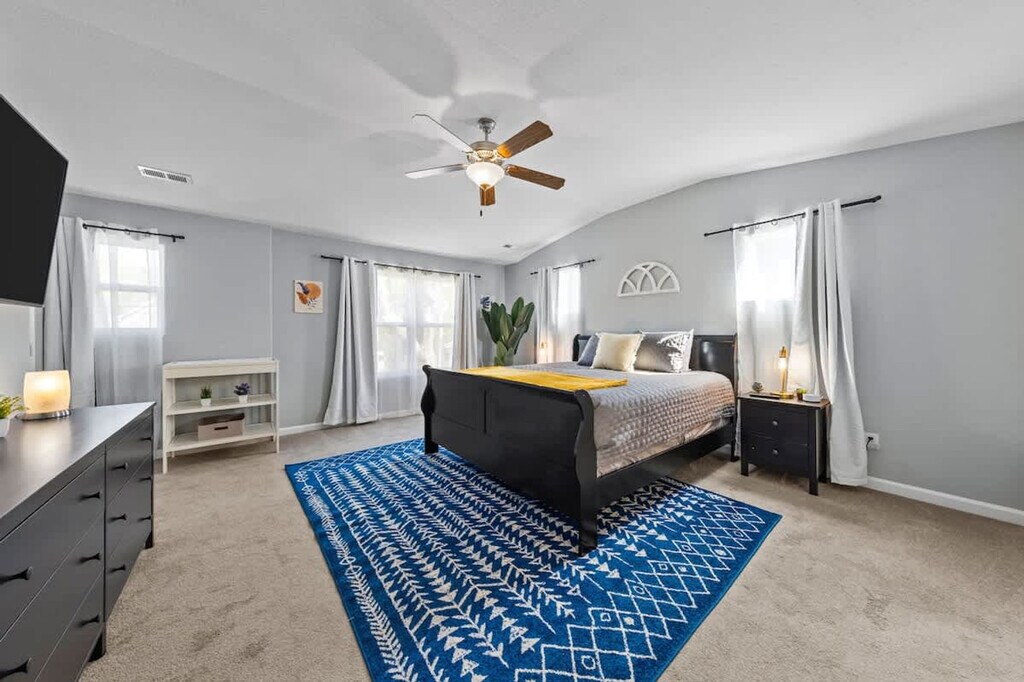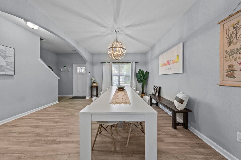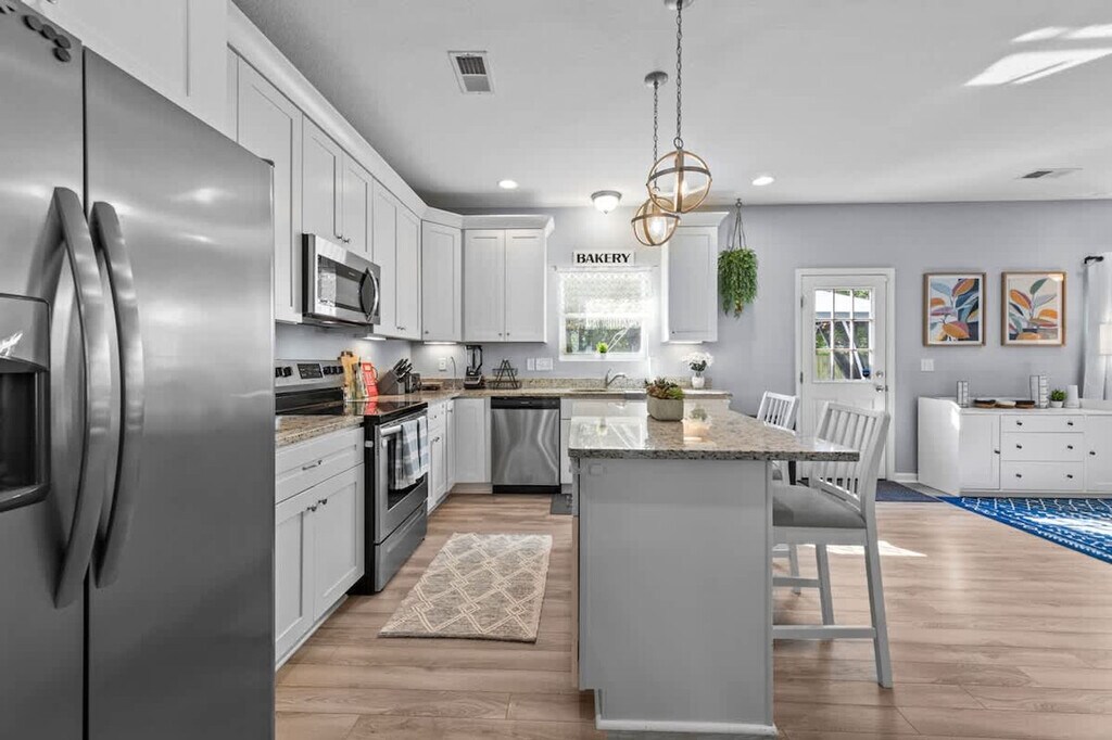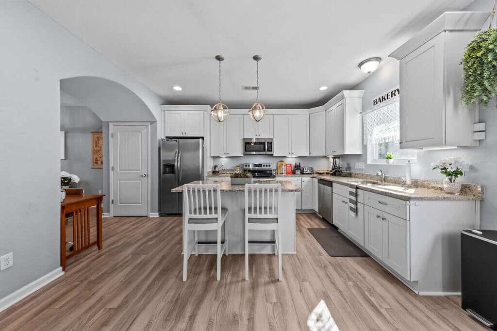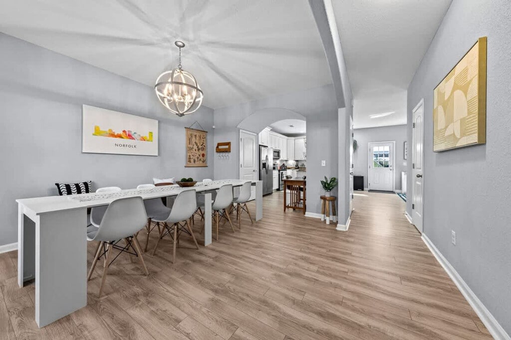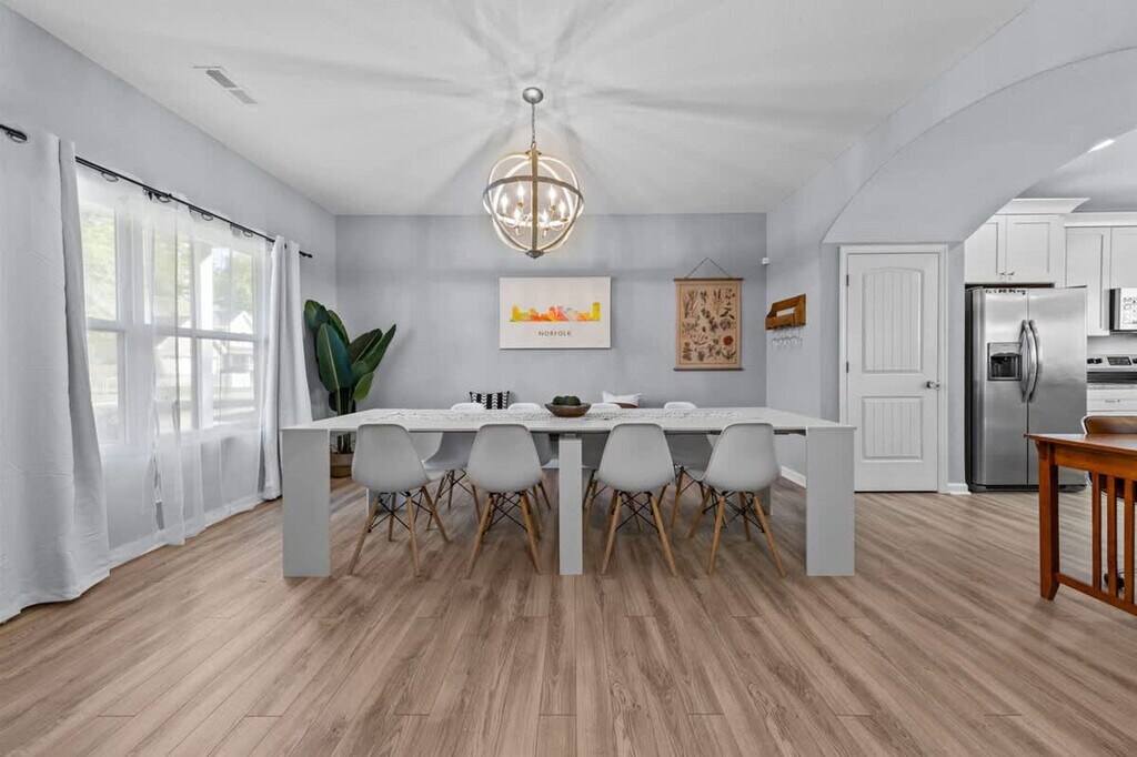 Welcome to the Homey Haven! Feel at home in this 2300 sq ft home with 3 beds and 2 1/2 baths, tailor-made for a big family gathering or getaway. Enjoy an open concept space, indoor/outdoor dining, and cozy bedrooms. This home features dining for 8, an outdoor projector and firepit, a BBQ, a child-proof interior, children's amenities like cribs and highchairs, and a fireplace. Dogs are allowed with a maximum of two dogs during your stay, with a $99 non-refundable pet fee. This home is conveniently located just 5 minutes from restaurants, 10 minutes from shopping, 15 minutes from OV Beach, and 22 minutes from VA Beach. Additional cleaning fees will apply for smoking indoors ($250), vomit/bodily fluid or waste ($250), illegal drug paraphernalia ($250), glitter or confetti ($200), unauthorized pets ($200 per pet), dirty dishes ($50), and missing towels ($20 per towel). Pets must not be left alone during your stay, you must pick up after your pet in the yard, and they are not allowed on furniture or beds. Evidence of pets on the furniture or beds will incur additional cleaning fees. Cats are not allowed at this property. If additional guests are brought beyond the original reservation guest total and the host is not notified, the booking will be canceled immediately with no refund and guests will be required to leave the property. Any additional guests over the amount specified in the reservation (or pre-approved by the hosts) will result in a $75 fee per person. Failing to vacate the property by the posted/agreed upon checkout time will result in a $60 per hour (pro rated) late checkout fee. Quiet hours must be maintained between 10pm-8am. Additional cleaning fees will apply for drug paraphernalia ($300), bodily fluid or waste ($300), glitter or confetti ($250), smoking ($250), unauthorized pets ($250), and dirty dishes ($50). Includes a dedicated office with speedy Wi-Fi. [SI]