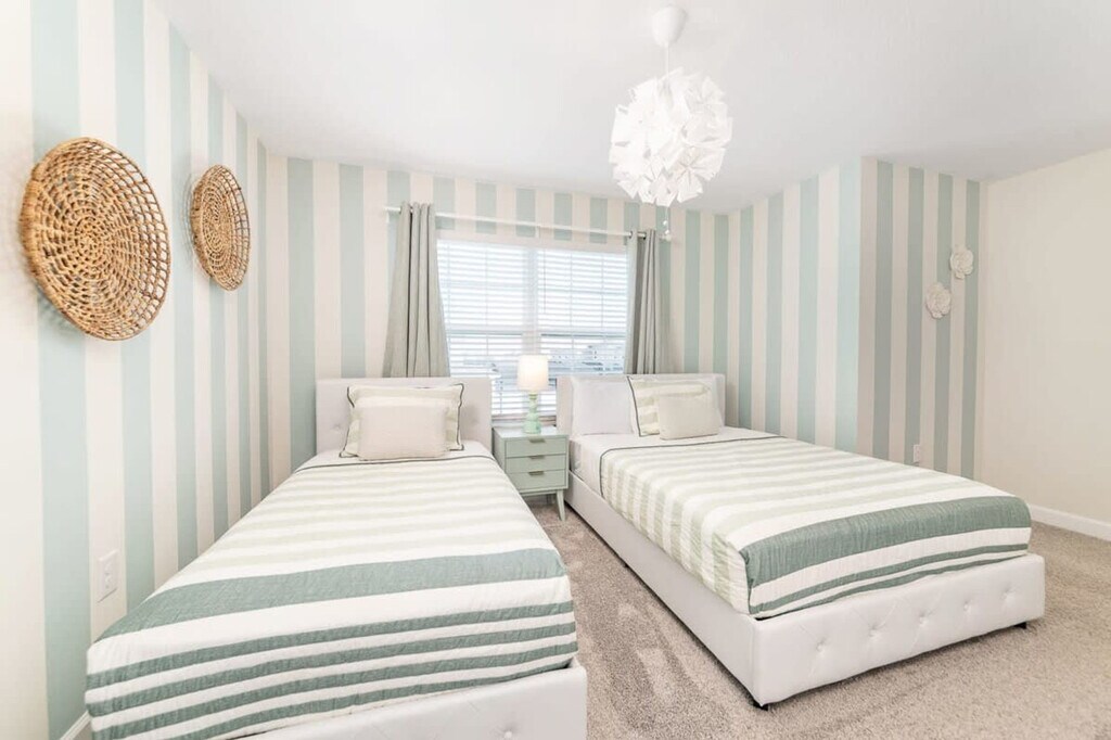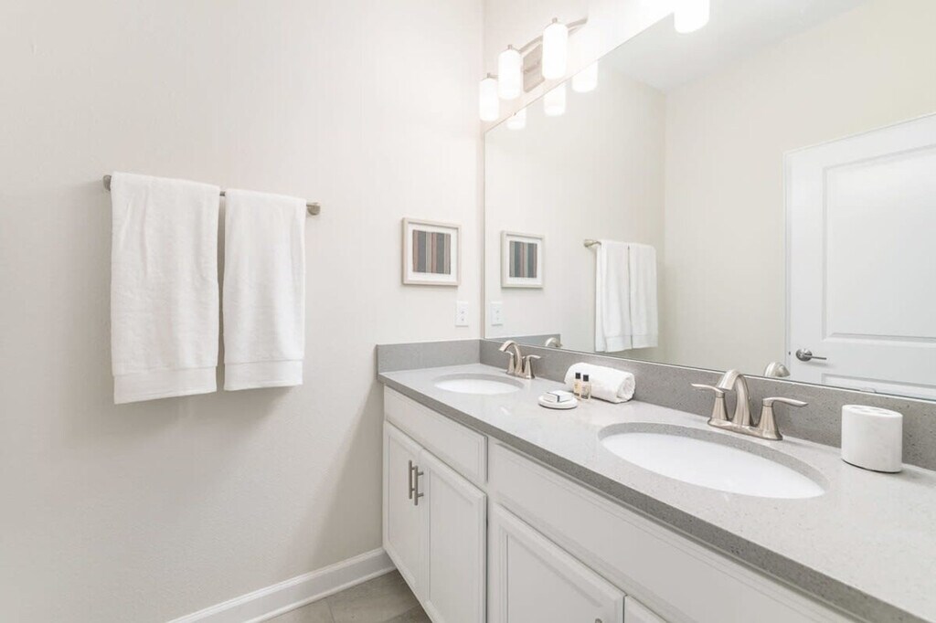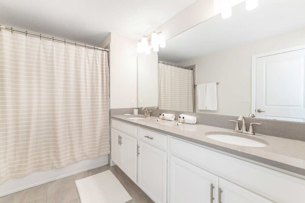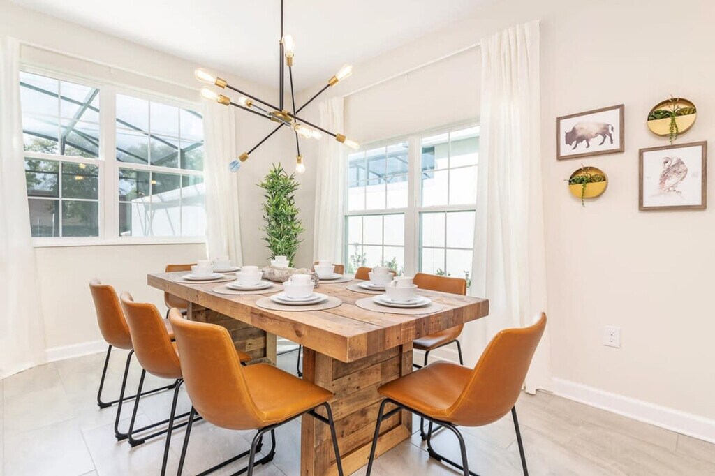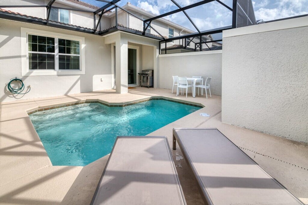 Indulge in the perfect blend of comfort and style in this exquisitely decorated 5-bedroom Storey Lake townhome. Located in Orlando's premier resort and just minutes from Disney parks, this spacious retreat offers accommodation for up to 11 guests. Unwind in the lap of space and enjoy leisure by your private pool. Your dream Orlando getaway is ready and waiting! Experience the ultimate family retreat in this 5-bedroom townhome designed for your comfort. The open layout seamlessly connects the living room, dining area, and fully equipped kitchen, creating an ideal space for gatherings. Step outside to the private patio with a heatable pool, blending relaxation with entertainment. The first floor features a convenient queen bedroom and another room with a double and a single bed, sharing a bathroom. Upstairs, indulge in the restful master king bed suite, another queen bed suite, and the 5th bedroom with 2 single beds and a private bathroom. For added convenience, find a laundry closet with a washer and dryer. Stay connected with complimentary Wi-Fi and enjoy hassle-free parking. A thoughtful welcome kit provides basic bathroom and kitchen amenities, with guests responsible for replenishing them. Pool heating and barbecue grill usage are additional paid services. Situated a mere 10-minute drive from Orlando's major attractions like Walt Disney World, Universal Resort, and Sea World, Storey Lake Resort boasts an ideal location. Unwind and bond with family at the resort's delightful amenities, including a tiki bar, a resort-style pool with slides and a lazy river, sports courts, mini-golf, kayaking, and a fitness center. Nestled just off Osceola Parkway, the resort offers seamless access to dining, shopping, and supermarkets, all within a convenient 5-minute drive. Quiet hours are between 22:00 and 8:00. [SI]