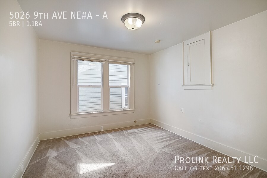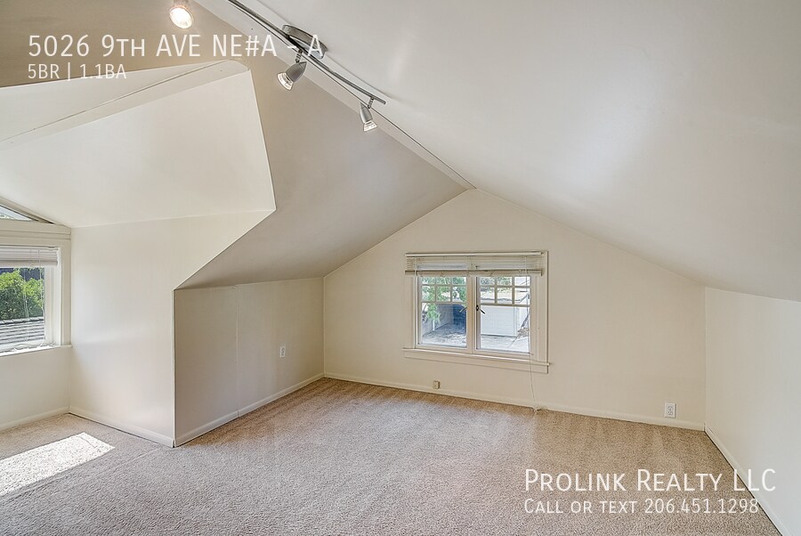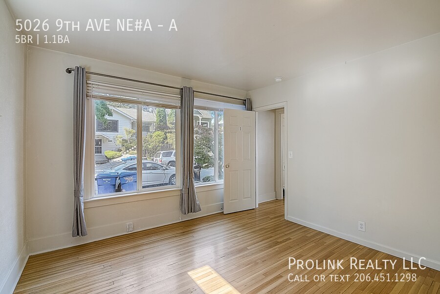 5026 9th Ave NE, Unit A, Seattle, WA 98105 Preleasing now, ava 8/10! Walk to UW, local shops, eats, cafes! Please email to schedule tour or for more pictures/information! Bright 5BR/1.5BA upper unit in well-maintained 2-unit house! Walkscore-rated “Walkers' Paradise” (95 out of 100) – close to UW campus, public library, and local restaurants, cafes, and shops! One FREE on-site uncovered parking, shared by both units on first come, first serve basis. Upper unit has hardwood floors, a finished Attic, Kitchen, cheerful Living Room on Main Floor, and an enclosed Front Porch and large Back Yard, plus in-unit Laundry Room with Washer/Dryer, plenty of storage space! * Listed rental rate includes charges for the reasonable usage of standard water/sewer/garbage/gas for hot water services by five adult occupants only; tenant responsible for all other in-unit utilities (electric, Internet, etc.) * Rent is $4,600.00/mo, Main Floor and Finished Attic (1,510sqft): 5BR/1.5BA/Kitchen/Living Rm/Utility Rm/Back Yd * See more pictures at: * The information above has been given to us by the Owner or sources that we deem reliable. We have no reason to doubt its accuracy, but we do not guarantee it. Prospective tenants should carefully verify all information contained above * Available 8/10 * No Smokers, No Pets * Terms: Minimum 12 months; NO summer-only, short-term, or month-to-month leases. 1st Month's Rent and Last Month's Rent due at lease-signing; refundable Security Deposit equaling half of one month's rent due at start of lease * Satisfactory credit check, background check (where applicable), and rental references required for all applicants and expected co-occupants aged 18 and over; non-refundable application fee (as charged by screening agency) is $45.00 + tax per applicant * No deposits accepted until application is processed and approved * Leased by Prolink Property Management, LLC, 14670 NE 8th St, Ste 168, Bellevue, WA * Equal Opportunity Housing: We are pledged to the letter and spirit of U.S. policy for the achievement of equal housing opportunity throughout the Nation. We encourage and support an affirmative advertising and marketing program in which there are no barriers to obtaining housing because of race, color, religion, sex, handicap, familial status, or national origin.