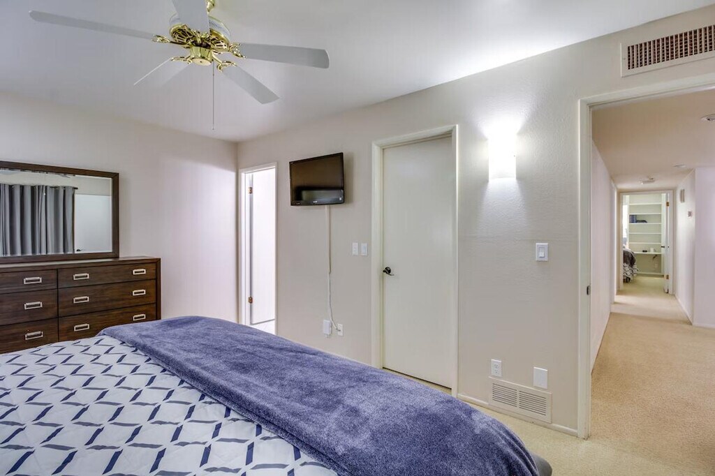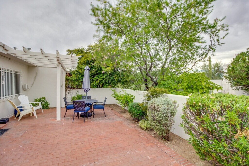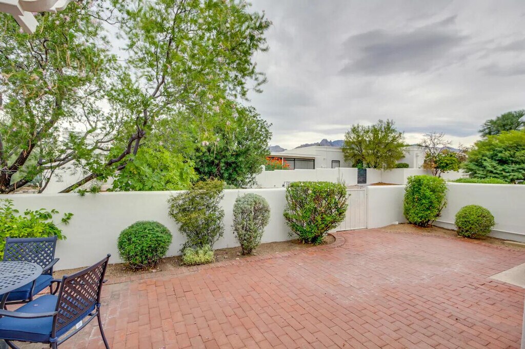 Feel at home in this peaceful 2-bedroom, 2-bath Tucson townhome, nestled in Northridge Villas. This lovely townhome features 2 Smart TVs with cable, a fully equipped kitchen, an in-unit laundry, a dining table, a massage chair, a laptop workspace, books, board games, ceiling fans, and a furnished patio. The kitchen includes a refrigerator, stove/oven, dishwasher, dishware/flatware, cooking basics, spices, a drip coffee maker, blender, Crockpot, microwave, toaster, and ice maker. Linens, towels, an iron, an ironing board, laundry detergent, trash bags, paper towels, hair dryers, and complimentary toiletries are provided. Enjoy step-free access and an outdoor dining area. Parking is available in the carport for 2 vehicles. Centrally located, this townhome offers easy access to the area’s most popular attractions. Relish the cacti and succulents at the Tucson Botanical Gardens or head downtown for shopping and a bite to eat. This property is located in a strict 55+ community; therefore, guests must be at least 55 years old to book and guests under age 55 are not permitted on-site. Smoking, pets, events, parties, and large gatherings are not allowed. Your safety matters. This property features 2 exterior security cameras: 1 camera is located on the back of the property facing toward the patio, and 1 camera is located next to the front door facing toward the front entry area. These cameras do not look into any interior spaces. These cameras record sound and video continuously and will be on during your stay. [SI]