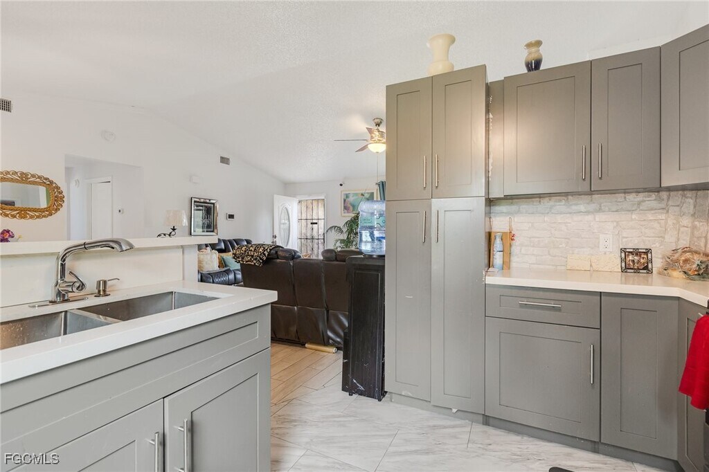 Beautifully updated 3-bedroom,2-bathroom residence,perfectly situated on a spacious quarter-acre lot in North Lehigh Acres. This home features a bright,open-concept floor plan accented by oversized tile and luxury vinyl flooring throughout. No carpet for easy maintenance! Newly renovated kitchen,sleek island,modern cabinetry,and a full suite of appliances,including a dishwasher and microwave. The split-bedroom layout ensures maximum privacy,with the primary suite featuring a spacious walk-in closet