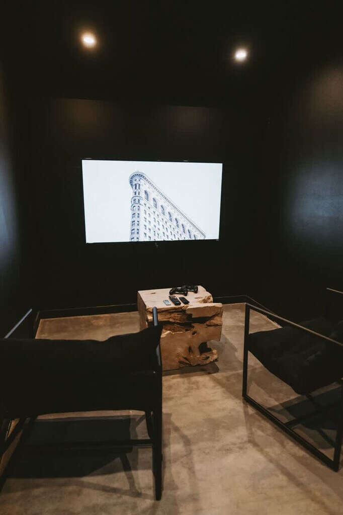 Experience A on D, Bentonville’s standout luxury A-frame in the heart of downtown. Feel at home in this one-of-a-kind home offering 2 bedrooms, 2.5 baths, and over 2,100 sq ft of light-filled living with soaring ceilings, floor-to-ceiling windows, and upscale finishes throughout. The heart of the home features a chef’s kitchen with premium appliances, an open living and dining area framed by soaring ceilings, and a wood-burning fireplace for cozy evenings. The king suite includes a spa-like bath with a walk-in shower and soaking tub, and a record player sets the tone for relaxing evenings. The private theater room provides the perfect space to unwind. A dedicated office and half bath add convenience. The shared queen bedroom offers two queen beds and access to a full bathroom with a walk-in shower. Well-behaved pets are welcome with prior approval and an additional fee. The home may be available for approved events with prior authorization and an additional fee. Please inquire in advance. Nestled in downtown Bentonville, A on D offers an ideal blend of urban energy and outdoor adventure. It's within walking or biking distance of the Bentonville Square (0.5 miles), Crystal Bridges Museum (1 mile), The Momentary (0.7 miles), and the city’s vibrant dining and gallery scene. For trail lovers, the famed Slaughter Pen mountain bike system is just minutes away, offering more than 14 miles of single-track trails for every skill level. Northwest Arkansas National Airport (XNA) is only 12 miles away, making arrivals and departures simple and convenient. From A on D, getting around is simple and convenient. The home is walkable and bike-friendly, with Bentonville Square, Crystal Bridges, The Momentary, and popular trails all close by. For longer trips, downtown parking is easy to find, and most attractions are just a short drive away. Ride-share services such as Uber and Lyft are readily available. Out of respect for neighbors, quiet hours are observed from 10:00 PM to 7:00 AM. Standard check-in is after 4:00 PM, and check-out is by 10:00 AM. Early or late arrangements may be available upon request. Government-issued ID verification may be required prior to arrival. [SI]