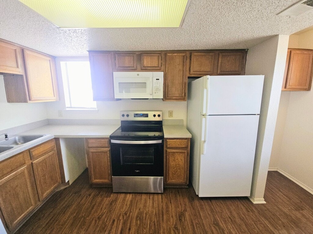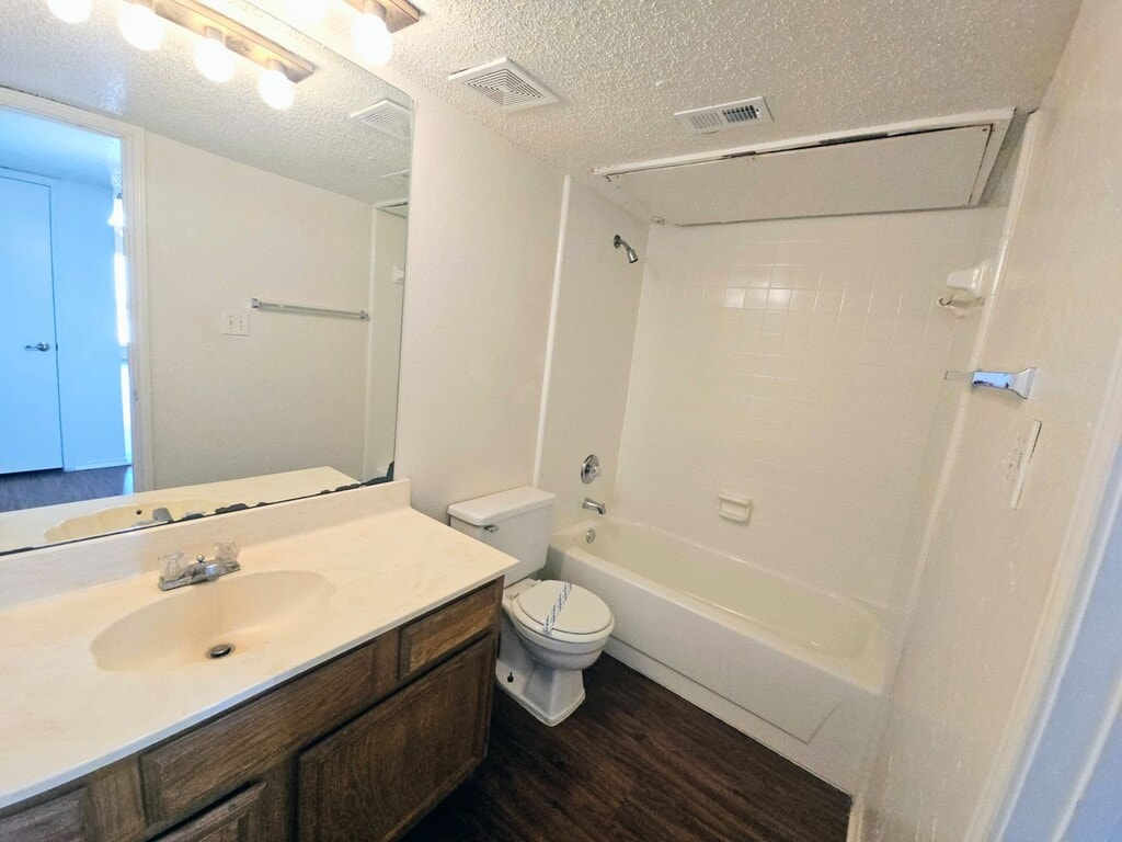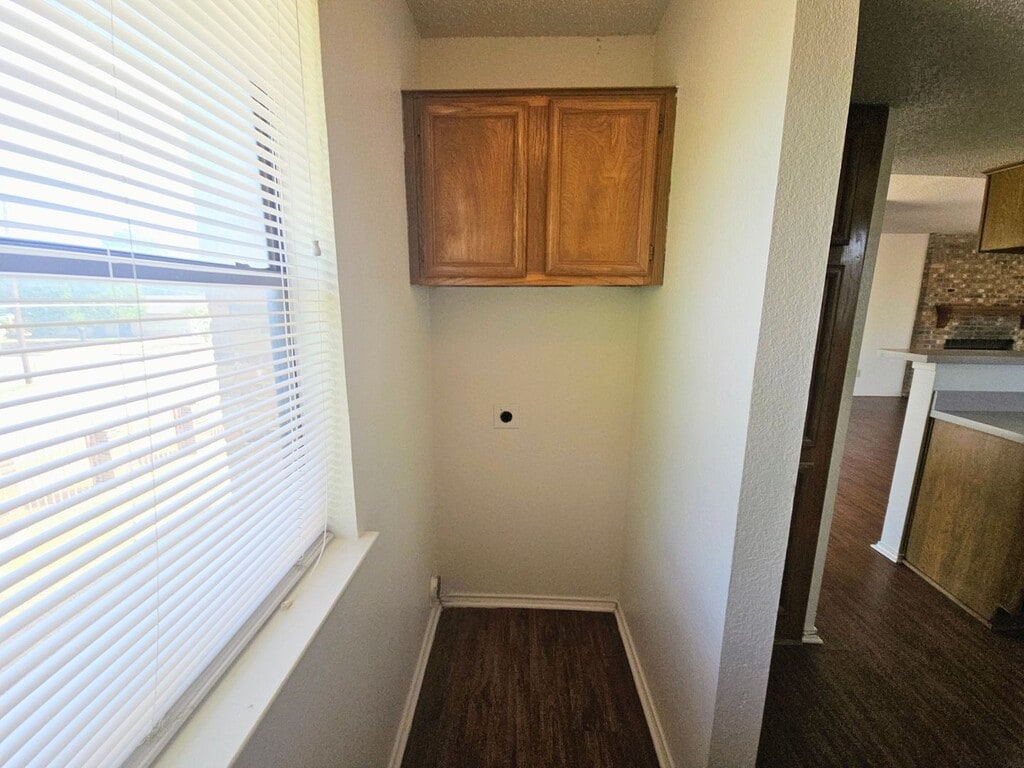 Upstairs single story unit. Vinyl plank flooring throughout. Ceiling fans in main living areas. The kitchen comes with a built in microwave. Fridge included but not guaranteed. Master bath has separate tub and shower and double vanity. Has utility room off kitchen. Covered balcony. There is a fireplace and single car garage. All electric. NO PETS. Comes with yard care. No smoking, no housing vouchers. TAR app. $65 app fee can be paid using credit card.Income needs to be 3x monthly rent, good rental and no bad rental in last 5 years. Renters insurance required. 2 vehicles max.