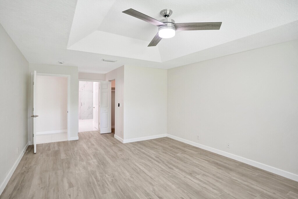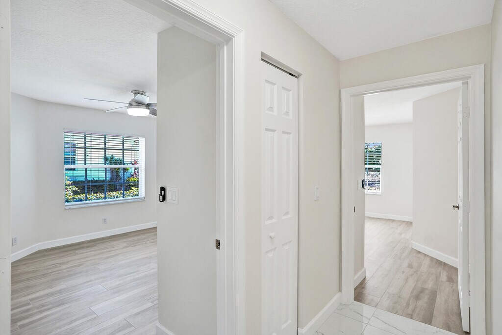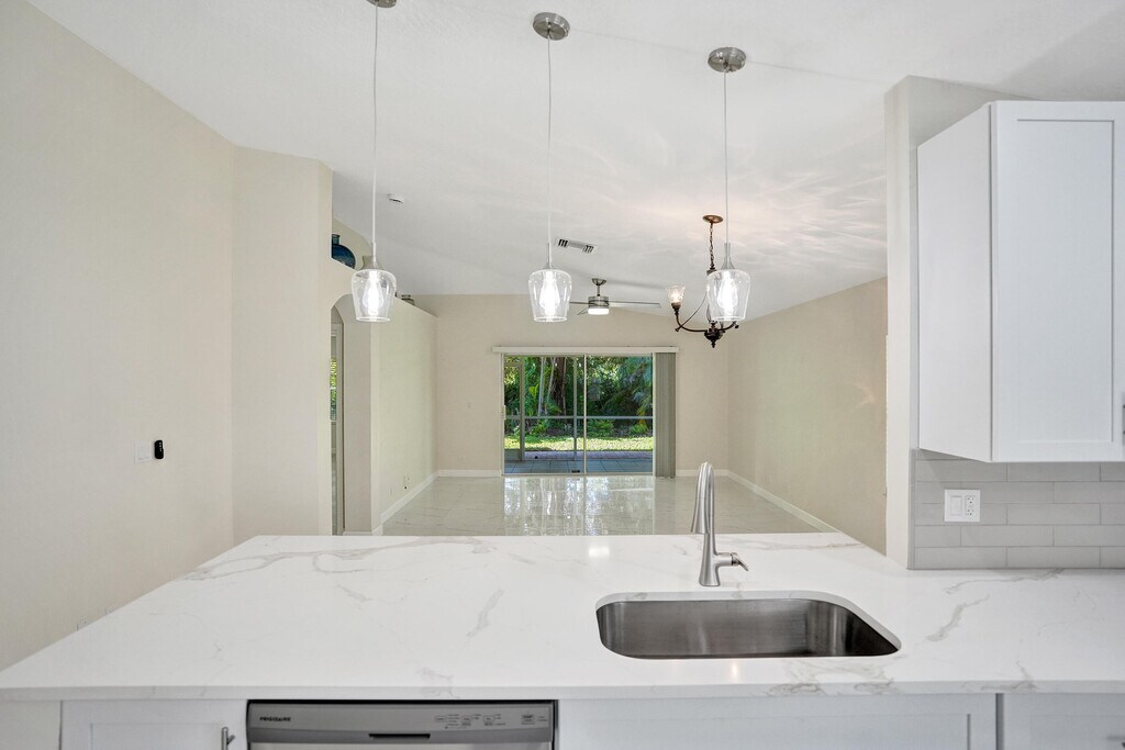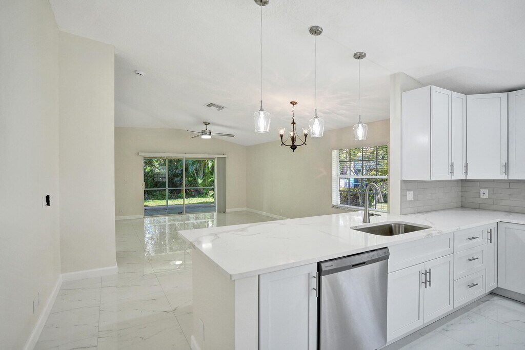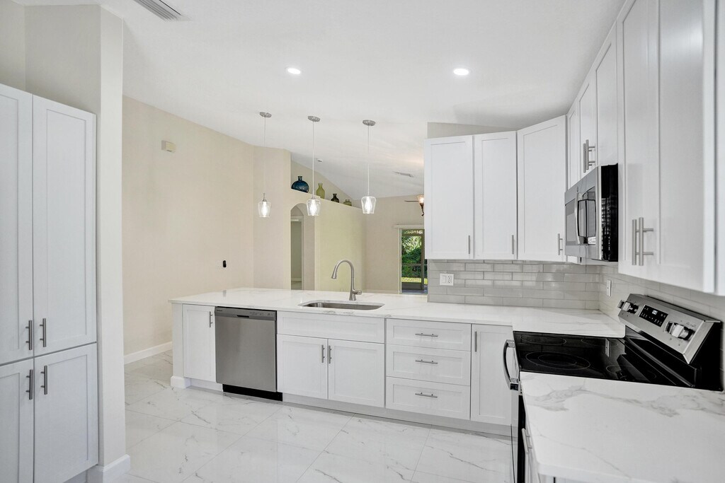 Step into this stunning corner 3 bedroom, 2 bath villa with a garage and a brand new roof, nestled inside one of Delray Beach's best kept secrets, a quaint gated community surrounded by lush nature yet just minutes from the vibrant shops, world class dining, and nightlife of Atlantic Avenue. Designed with a split floor plan and soaring vaulted ceilings, this home feels airy, spacious, and filled with natural light. Every detail has been completely renovated to perfection, with a sleek open kitchen featuring Calcutta Gold quartz countertops, artisanal glass subway tile, fresh stainless steel appliances, and new flooring throughout. The oversized primary suite is a private retreat with a marble inspired shower with a neutral pebbled floor, glass shower doors,