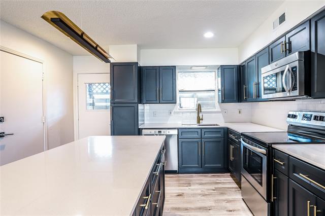 Discover modern living at its finest in this beautifully updated 2-bedroom, 2-bath condo in the heart of Dallas. Every inch of this home has been thoughtfully designed with comfort and style in mind. Step inside to find an open-concept layout with luxury vinyl plank, ceramic tile flooring and an abundance of natural light. The stunning chef-inspired kitchen boasts sleek navy cabinetry, quartz countertops, a spacious island, and stainless steel appliances, creating the perfect space for cooking and entertaining. The primary suite is a serene retreat featuring a designer ensuite bath with dual sinks, brass fixtures, and a striking glass walk-in shower with custom tile. Both bathrooms showcase high-end finishes and modern details that bring a boutique feel to everyday living. Enjoy relaxing in the bright, open living area or take in the sunshine at the sparkling community pool—ideal for unwinding or meeting neighbors. This condo offers a rare combination of sophisticated design, convenient location, and low-maintenance living, all just minutes from local dining, shopping, and entertainment.