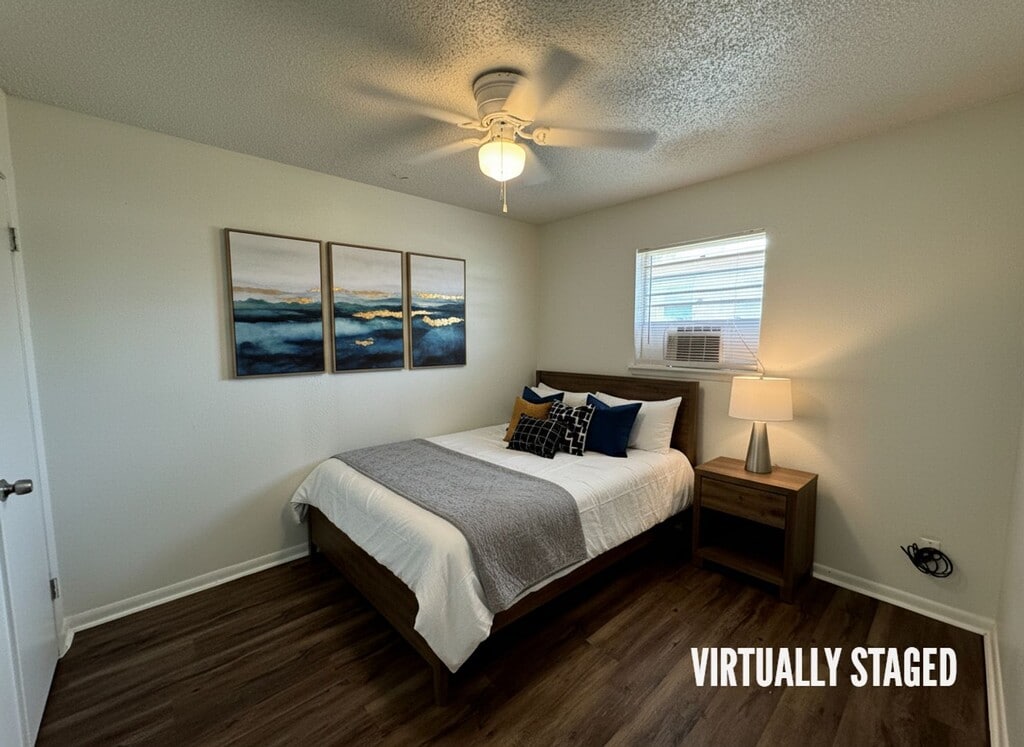 View 360 Virtual Tour: All the comforts of your home and all the savings for your budget! This single story 6-plex features unit D, a corner unit closest to the parking lot with screened storm door, privacy blinds, and linen closet in the full bathroom. No carpet helps keep you cool in warmer months, while multiple ceiling fans throughout the home also wok well to help you maintain a comfortable temperature in this open and roomy floorplan. Greenspace behind and around the complex allow for outdoor fun, while the onsite parking lot delivers on convenience and safety. Disclaimer: The furnishings or enhancements shown are AI-generated and intended for inspiration only. They may not reflect the actual scale, condition, or current features of the property.