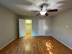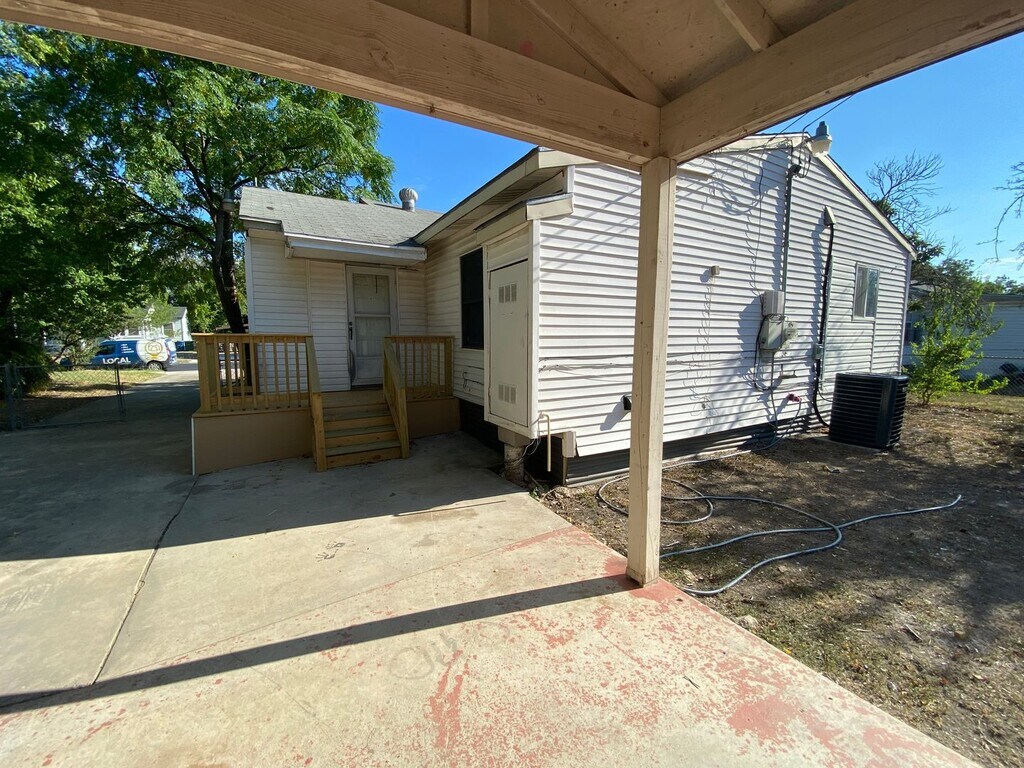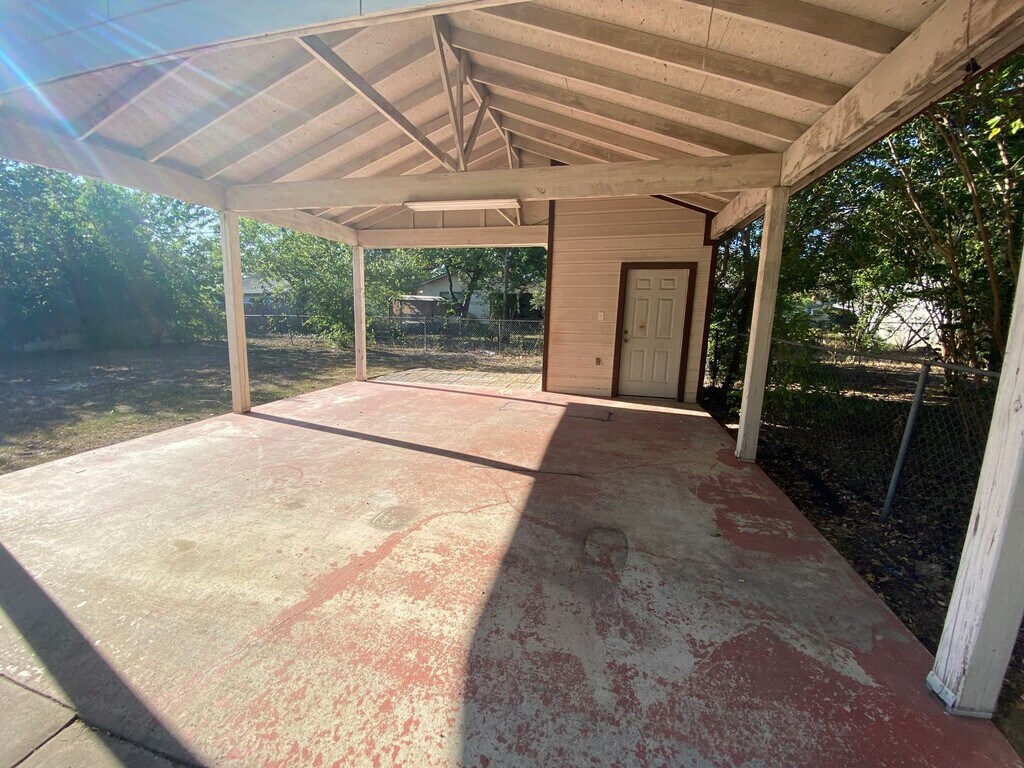 This property features hardwood floors, three bedrooms, and two full bathrooms. The kitchen includes a breakfast bar and countertops. There is an interior laundry room. The master bedroom is spacious with a large walk-in closet. A covered carport is present with stained concrete at the back driveway, along with an attached storage room. The yard is fenced and includes mature trees, offering shade during the summer months.