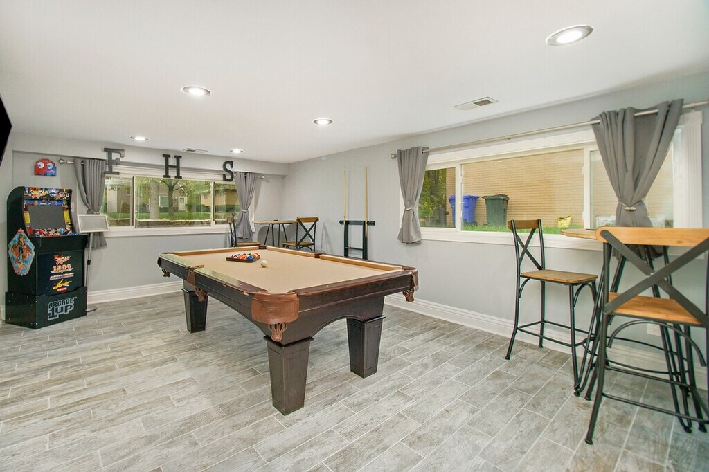Feel at home in this renovated 4-bedroom home, located 21 minutes from downtown Naperville. This updated home, renovated in 2020, features updated carpet and flooring. The kitchen is fully equipped with all the utensils you need, including cooking spices and oils. For entertainment, there are cards, games, a pool table, and an arcade cabinet with over 2000 games. There are also five LCD televisions, a sound bar in the living room, and a spacious, fenced backyard. Parking is available with a 2-car garage, a 50-foot driveway, and public parking. A pack and play sleeper, stroller, high chair, and booster seat are available for children. Downtown Naperville is like a bustling mini-Chicago, including a beach and plenty of bars and restaurants. If the home has a fireplace, it is not for guest use. Up to 300 MBPS internet speed is available, with Wi-Fi throughout the entire home and an ethernet hard line available. Netflix and Prime Video are accessible with your own login. The 55" TV is in the living area, and 40" TVs are in the bedrooms. [SI]