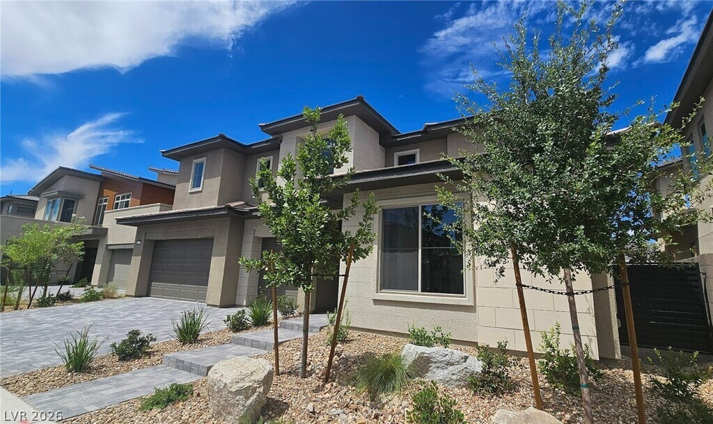 Located in Ascension in Summerlin South, this 5-bedroom, 6-bath home with a 3-car garage offers modern design and quality finishes throughout. The open-concept floor plan features a kitchen with a stainless steel Signature appliance package, oversized island with breakfast bar seating, and a walk-in pantry with prep area. Custom-designed window coverings and shades, along with professionally completed landscaping, enhance the home’s move-in-ready condition. A first-floor ensuite bedroom provides flexibility for guests, while a den with bath offers space suitable for a home office or study. Upstairs, the owner’s suite includes a sitting area with balcony access and a bath with dual vanities, soaking tub, walk-in shower, and walk-in closet. A central loft connects the secondary bedrooms, including one with its own ensuite bath. A community clubhouse scheduled to open this summer is planned to include a pool, pickleball courts, fitness center, and gathering spaces.