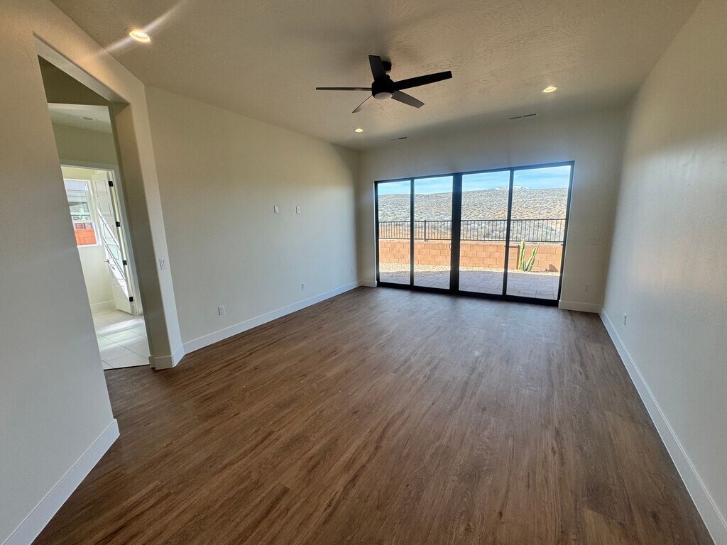Enjoy incredible unobstructed views of BLM land with 30 miles of trail systems right out your back door. Take in scenic views of Pine Mountain from the front courtyard and relax in the peaceful, open surroundings this home offers. This brand-new, single-level home features four private suites, each with its own attached bathroom—ideal for privacy and comfort. The spacious Great Room offers an open-concept layout that’s perfect for gathering and entertaining. The kitchen is thoughtfully upgraded with high-end GE Café appliances, along with quality finishes and upgrades throughout the home. Additional highlights: - 34'10" RV garage - Washer & dryer included - Direct backyard access to hiking and some of southern Utah's best mountain biking trails - Minutes from downtown, the freeway, and Snow Canyon Enjoy comfort, space, and unbeatable access to outdoor adventure in this exceptional rental opportunity! NO SMOKING/VAPING ALLOWED. NO PETS ALLOWED. *$45 Non-refundable application fee per adult. **Each adult over the age of 18 must fill out a separate application. ***All applications are online at