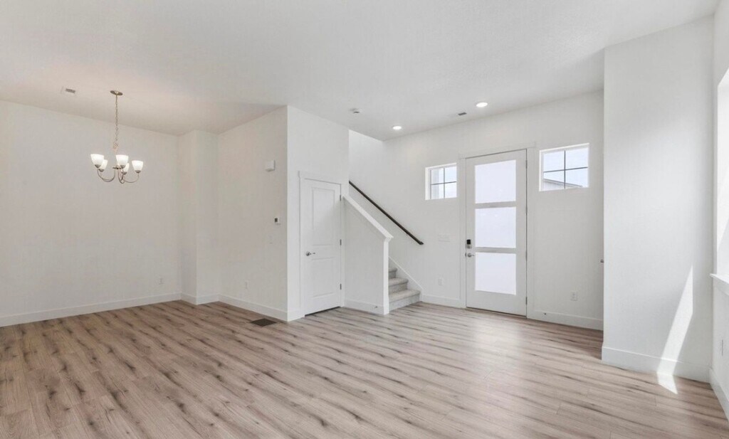 This BRAND NEW beautifully designed 1,739 sq. ft. paired home offers 3 bedrooms and 2.5 bathrooms, providing the perfect balance of space and comfort. The open-concept main floor includes a great room, dining area, half bath, and a modern chef-inspired kitchen with quartz countertops, a gas range, brand new Whirlpool refrigerator, upgraded cabinetry, and ample storage. Just off the kitchen, enjoy a large 19’ x 10’ covered patio overlooking the private fenced yard—ideal for entertaining or relaxing outdoors. Upstairs, the owner’s suite features a private ensuite bath with dual vanities and an oversized walk-in closet. Two additional bedrooms, a full bath, and a conveniently located laundry room with brand new washer/dryer complete the second floor. Additional features include a 2-car attached garage and access to all of the amenities within the desirable Trailside community. Schedule a showing starting November 25, 2025. Preferred lease duration is 1 year. This property is unfurnished. Owner is responsible for sewer and trash. Security Deposit amount determined by the owner.