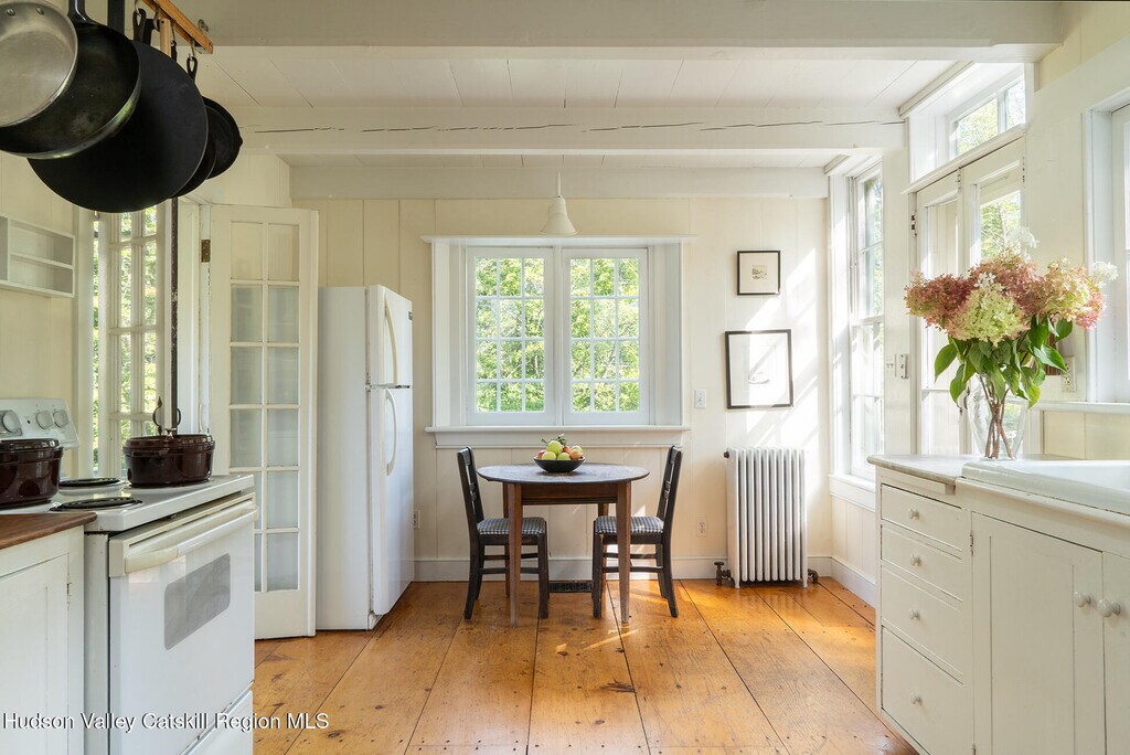 A magical cottage designed by two. extraordinary designers. It is a very thoughtful created space with many beautiful moments. There are 3 bedrooms,the principal has a bath en suite. The living room/dining room is light and spacious with beautiful tall narrow french doors. There is a charming porch off the kitchen and a lovely back lawn. 15 minutes to Hudson/5 minutes to Germantown.