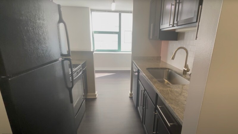Bright, spacious 2-bed with in-unit laundry and resort-style amenities. Sun-splashed living/dining area features wide-plank hardwood floors and plenty of room to entertain or work from home. Both bedrooms are generously sized, and the layout offers great flow with multiple furniture configurations. Modern lighting and large windows keep the home feeling open and airy throughout. Building perks include a resident pool and a well-equipped fitness center