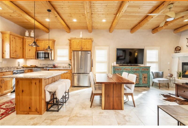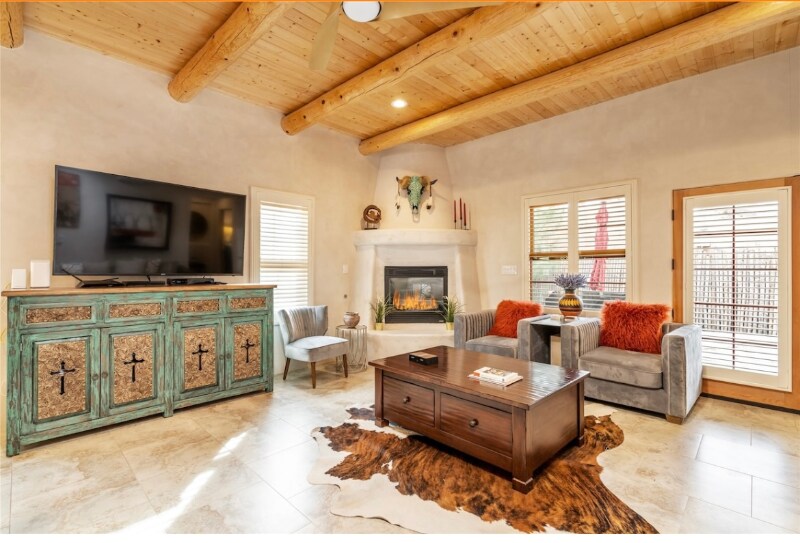 Property Id: 2114784 Come live in downtown Santa Fe, walking distance to The Plaza and Canyon Road. Walk to a fantastic market, coffee shops, bookstores and all the shops on the Plaza! Quiet dead end street. Looks historic, but built in 2017 with all the comforts. Totally furnished single-story home in a gated compound with a coveted attached garage. Diamond plaster walls, high ceilings, viga and skylights. Private patio along with a beautifully designed outdoor entertaining area. All utilities included. Prefer multiple month rental.