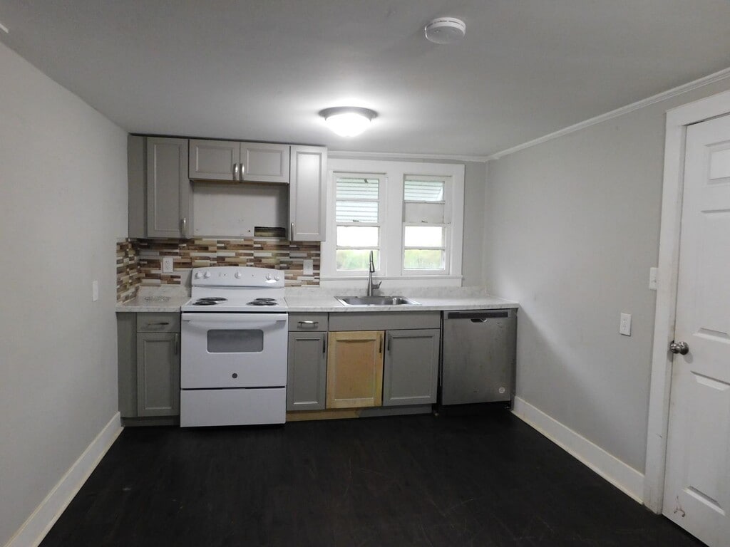 3-bedroom, 1 bathroom, living room, dining room with baseboard heat and window units. Large eat in kitchen with brand new Refrigerator and electric range, also includes dishwasher. Washer and dryer hook up in utility area. Small back yard and off-street parking. No pets, No Smoking, No EIC. Some additional fees apply.