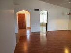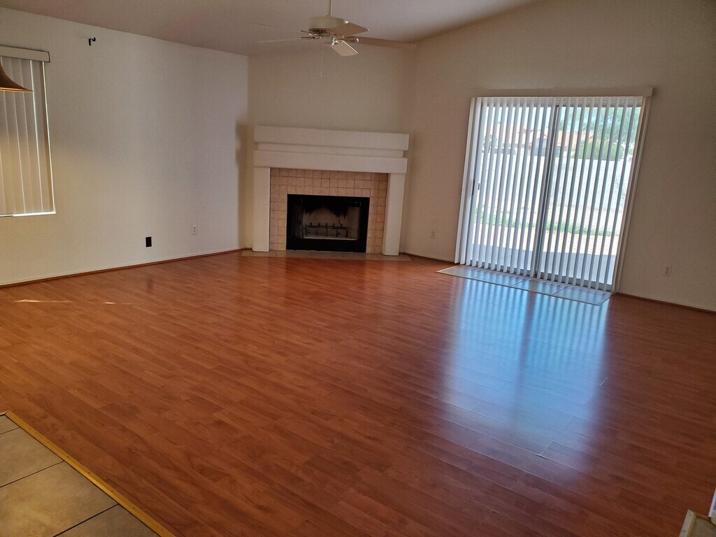 Three Bedroom, 2 baths, Over 1500 sq. ft. Tiled entry,Kitchen and baths. Laminated wood flooring in Great Room and all bedrooms. Formal dining area in Great room, Eat in Kitchen. Large Master, bath w/double sinks, walk in closet. Ceiling fans, Double garage, corner lot. Front Yard Landscape included with rent. Sorry but no pets.