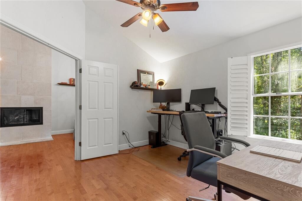 Haile Plantation Indigo Square 3/2. Annual rental available 11/24/2025. Elegant spacious cottage-style single family home with attached garage. This 1,498 sq.ft. home has been updated with attention to detail and is light & bright,with soaring ceilings and beautiful hardwood floors. Kitchen features soapstone countertops,stainless steel appliances including a gas range,side by side refrigerator,convection oven,built in microwave and newly tiled back-splash. The large living rooms has high ceilings and beautiful gas fireplace. The beautifully updated master bedroom features a walk-in closet,walk in shower and tons of space. The outdoor patio provides plenty of space for cook outs or quiet relaxation. Conveniently located and just a short stroll along the nature trail to the Haile Plantation Main Street,filled with shops,dining,and weekly Farmer's Market. Security Deposit & Renters Insurance policy. Credit & background check. MLS# GC534525