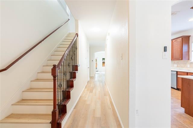 Energy star home with 4bed & 2.75bath. Vinyl floor in the whole house & tiles for wet areas. Formal dining at entry can be an office. Spacious kitchen & nook opens to the family room with stainless steel appliances, Quartz countertops with large rectangle sink, 42in tall cabinets. Master bath dual high vanity, garden tub & separate shower. Upgraded vanity lights, faucets, hardware, and ceiling fans in all rooms. Upstairs 3 bedrooms with Jack & Jill bath, huge game rm. Large yard backs to greenbelt, full sprinkler & full gutter. Great community amenities. Easy access to DART, I35E & Denton Medical Center. Top rated elementary within walking distance. Hike trails nearby! Must see! Pets Allowed!
