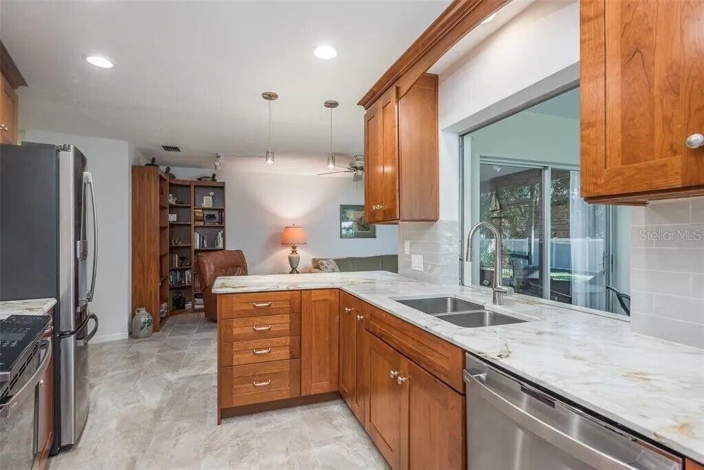 Beautifully updated 2BR/2BA Mid-Century Modern POOL home with an additional 220 sq ft enclosed porch/sunroom,located in the desirable CRYSTAL BEACH community. Situated on a high-elevation double corner lot,the home features a split floor plan that provides both privacy and functionality. Recent updates include a new AC system,skylight,flooring,sunroom,ceiling fans,lighting,kitchen,and high-end appliances. The family room with fireplace creates a comfortable gathering space,while hurricane-protected windows offer added energy savings. Outdoor living is highlighted by a deep saltwater pool with sundeck and travertine pavers,with pool service included for a maintenance-free lifestyle. Additional exterior features include a new no-see-um screened lanai,welcoming front porch,2-car side-entry garage,circular driveway,and mature landscaping. The fenced backyard includes a parking pad with RV or boat hookup,and lawn care is also included. Conveniently located near Sunset Beach,Live Oak Park,and the Pinellas Trail,providing easy access to waterfront sunsets,outdoor recreation,and the charm of the Crystal Beach community. MLS# TB8486889