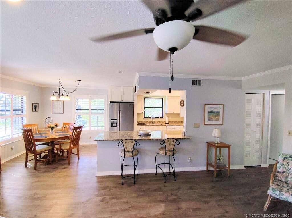 Welcome to this beautifully maintained community featuring tree-lined streets and sidewalks.Ideally located in Stuart,this inviting 2-bed,2-bath 2nd floor corner “A” unit offers abundant natural light and a spacious,thoughtfully designed layout.This tastefully furnished home features an updated open kitchen.The primary suite provides a peaceful retreat with a private lanai showcasing serene water views.Add'l highlights include plantation shutters,crown molding,easy-care flooring,and accordion storm shutters for added peace of mind.All appliances including washer/dryer.Rent includes all utilities except electric.Enjoy an active lifestyle with resort-style amenities: a large heated pool,tennis courts,pickle ball,bocce,shuffleboard,fitness center,billiards,workshop,barbecue area,fishing pier,& a vibrant clubhouse with a full calendar of social activities. Conveniently located near shopping,downtown Stuart,medical centers,dining,parks,and just a short drive to the beach. MLS# M20055250