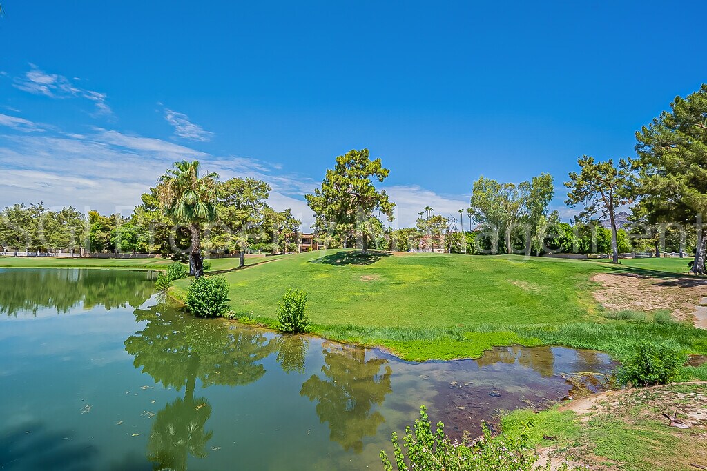 Spacious condo in lakefront community of Biltmore Terrace. This gorgeous unit features travertine and wood throughout. The kitchen offers granite countertops and backsplash, stainless steel appliances, and upgraded cabinetry. Spacious living room with built in shelving, and cabinets. Just steps to groceries, and more. And minutes from the 51, Biltmore Fashion Park, and Old Town Scottsdale. Call today! Visit our website at: Lessee to verify all information Community Pool Dogs And Cats Allowed Dryer Electric Range Pets Allowed Washer Washer/Dryer In Unit
