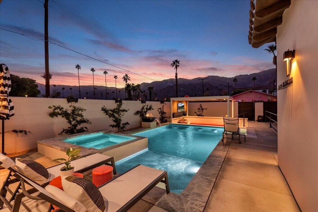 Escape to this modern desert oasis featuring 4 ensuite bedrooms including dual masters,a resort-style pool with swim-up bar,sunken firepit lounge with TV,BBQ area,and putting green. Enjoy high ceilings,quartz finishes,and seamless indoor-outdoor living with mountain views. Perfect for families or groups seeking luxury,relaxation,and entertainment in a private gated retreat. MLS # 219137974