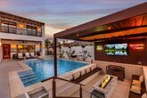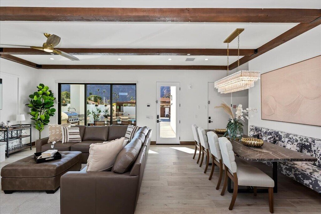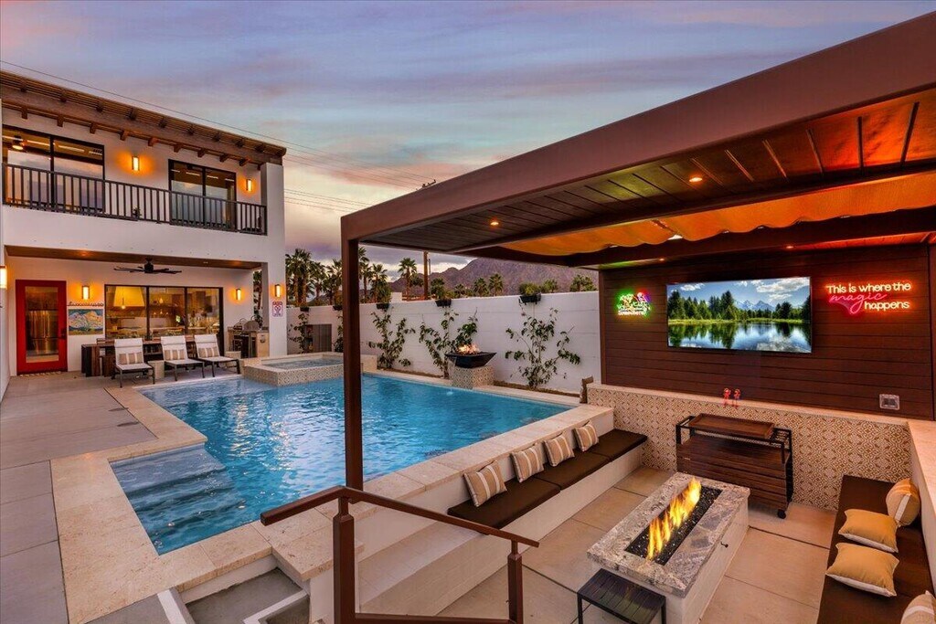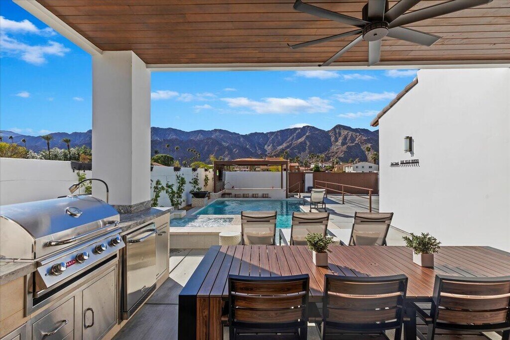 Experience Santa Barbara charm in Old Town La Quinta with this new build luxury 4-bedroom retreat. Featuring ensuite baths,dual masters,a resort-style pool with swim-up bar,firepit lounge with TV,outdoor dining & BBQ,and putting green. High ceilings,quartz finishes,balconies with mountain views,and seamless indoor-outdoor living create the perfect desert escape steps from dining,cafes,and shopping. MLS # 219143077