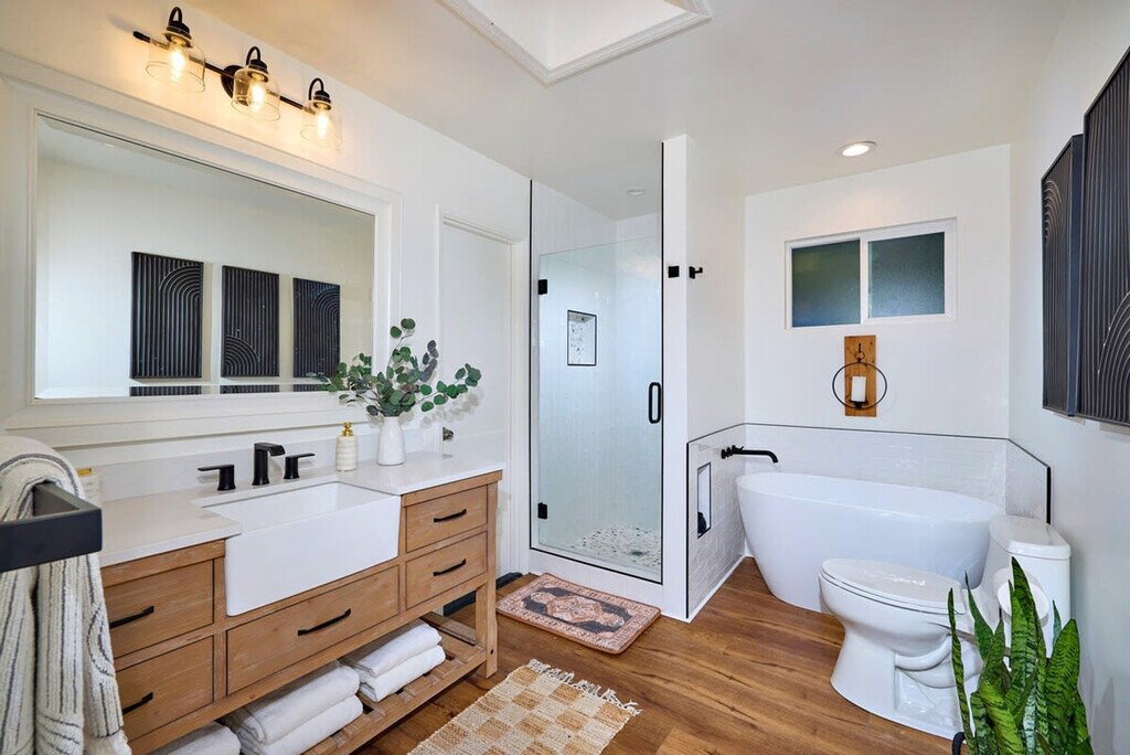 Nestled in the heart of Southern California’s coastal paradise on Carlsbad’s most desirable street, this charming beach house features a large new rooftop terrace. This spacious 3-bedroom single-level home boasts modern amenities and coastal-inspired décor, creating an upscale retreat for families, couples, or solo travelers. Enjoy breathtaking white-water and sunset views from the new terrace, the perfect backdrop for your morning coffee or end-of-day cabernet. Welcome to this exquisite beach vacation rental with a new rooftop deck and game room in the charming coastal town of Carlsbad, California. This sun-drenched retreat is a stone’s throw from the Pacific and features three inviting bedrooms, two luxurious bathrooms, and three distinct outdoor living areas providing expansive space for families or groups of friends seeking a memorable seaside getaway. Step inside to discover a bright and airy living space adorned with coastal-inspired decor, offering a cozy haven to relax and unwind after a day of exploring the nearby beaches and attractions. The gourmet kitchen with modern appliances and corona countertops invites guests to create delicious homemade meals to be savored in the dining area or alfresco on the private patio within earshot of crashing waves. Each thoughtfully appointed bedroom ensures a restful night’s sleep, with plush bedding and tranquil ambiance. Get some sun and relax on the new rooftop terrace while watching surfers and sailboats play in the sea. The new large game room has a flatscreen TV, ping pong and shuffleboard tables, plus beach chairs and boogie boards for beach fun. The private backyard features shuffleboard and a barbeque. Nestled along the sun-kissed shores of Coastal Carlsbad, California, this vacation rental offers an unparalleled beachside retreat. This idyllic coastal enclave is renowned for its pristine beaches, year-round sunshine, and laid-back atmosphere, making it the perfect destination for a relaxing getaway. Just steps away from the sparkling Pacific Ocean, guests can stroll along the sandy shores, soak up the sun, or enjoy a variety of water activities, from surfing and paddle boarding to simply basking in the coastal breeze. Explore the charming village of Carlsbad, where quaint boutiques, art galleries, and world-class dining establishments await. Indulge in fresh seafood cuisine, sample local wines, or simply savor the breathtaking ocean views from one of the many seaside cafes. With its perfect blend of natural beauty and coastal charm, Coastal Carlsbad beckons travelers to unwind, rejuvenate, and create lasting memories against a backdrop of endless blue skies and the beautiful Pacific Ocean. The gated beach access gate across from the home is not usable for guests. Access to a family-friendly lifeguarded beach is an easy walk north about two blocks. Quiet hours are between 21:00 and 8:00. No large gatherings, parties, or loud noise are allowed at the property to respect neighbors and city regulations. [SI]