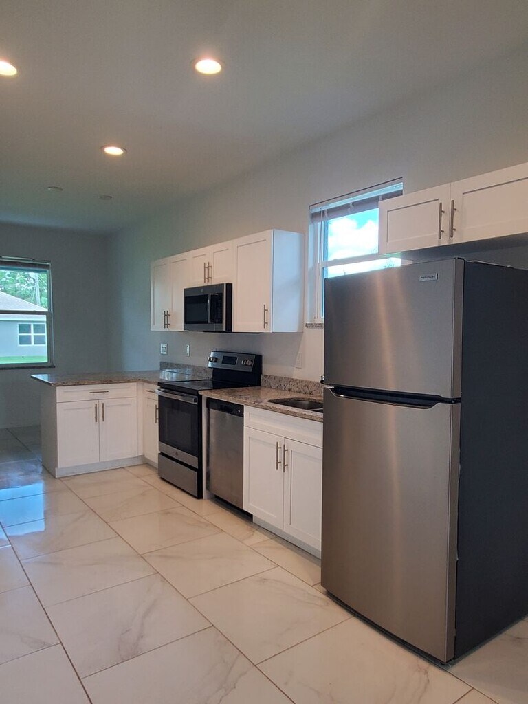 Welcome to your dream home in the heart of Lehigh Acres, FL. This newer construction has three beddrooms, 2 bathrooms and a one care garage. Located in the Greenbriar subdivision of Lehigh Acres. Its nestled in a private setting, offering a large backyard on a quarter-acre lot. The house features three spacious bedrooms, including a primary bedroom with an en-suite that boasts a large tiled shower. The home also includes two quest bedrooms and a guest bathroom, all with tile floors throughout. The chef's kitchen is a culinary delight with stainless steel appliances, granite counters, a large peninsula island, two pantries, and wood shaker cabinets. The open floor plan includes a living and dining room with a galley kitchen, perfect for entertaining. Additional amenities include an attached one-car garage, an extra driveway on the lot, impact windows, an open front porch, and a covered rear lanai. The home also offers an inside laundry with a washer and dryer. Pets are welcome in this move-in ready home. Conveniently located close to ST RD 80, this home is a must-see today!