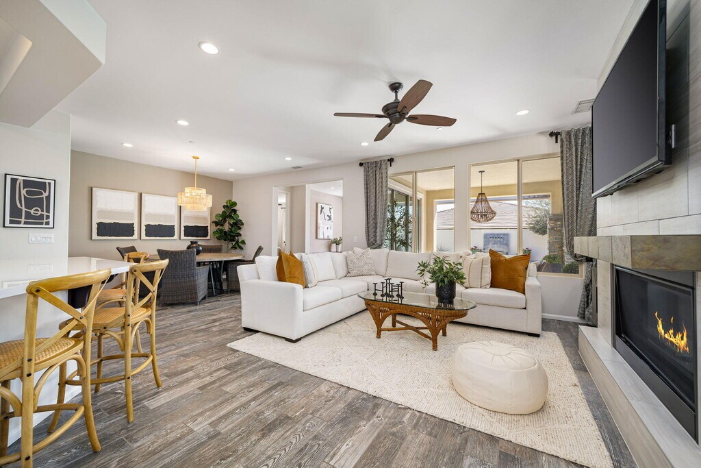 Offered- For Lease or Sale. Move-in ready and beautifully finished,this 2BD/2BA + office/den home is located in the highly sought-after Trilogy Polo community. This popular Monaco model has been meticulously maintained and showcases premium finishes throughout. Step inside to discover a thoughtfully designed floor plan featuring a great room with a decorative fireplace that flows seamlessly into the dining area,den,and updated kitchen--creating an ideal setting for both everyday living and entertaining. The kitchen is appointed with stainless steel appliances,quartz countertops,a designer backsplash,and enhanced cabinetry with ample storage. Designer touches throughout the home include recessed lighting,wood shutters,tile flooring in the main living areas,new carpet in the bedrooms,and elegant two-tone paint. The primary suite offers a peaceful retreat with a walk-in closet,dual vanities,quartz countertops,and an oversized tiled shower with bench seating. A large rolling wall of glass opens to the private outdoor living space,creating a seamless indoor-outdoor experience. The backyard is perfect for relaxing or entertaining,featuring a covered patio,firepit,and soothing fountains in both the entry courtyard and backyard. MLS # 219144750